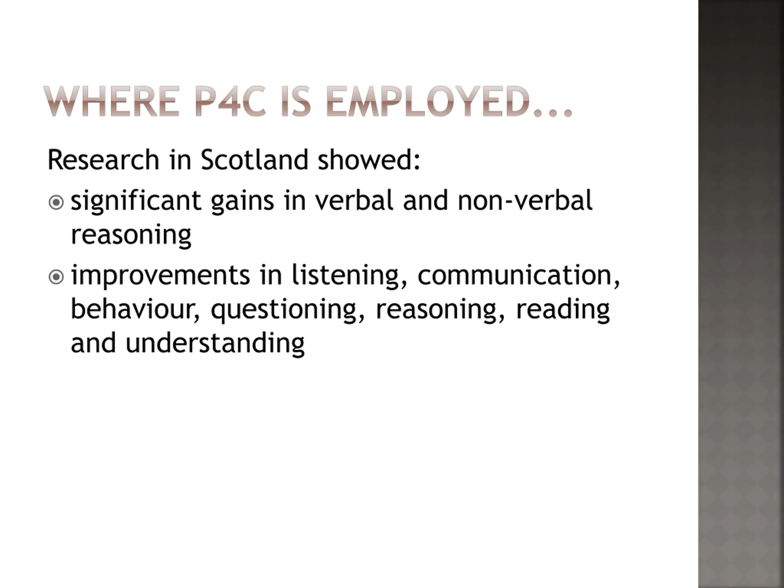 WHERE P4C IS EMPLOYED... Research in Scotland showed: significant gains in verbal and non-verbal reasoning improvements in listening, communication, behaviour, questioning, reasoning, reading and understanding