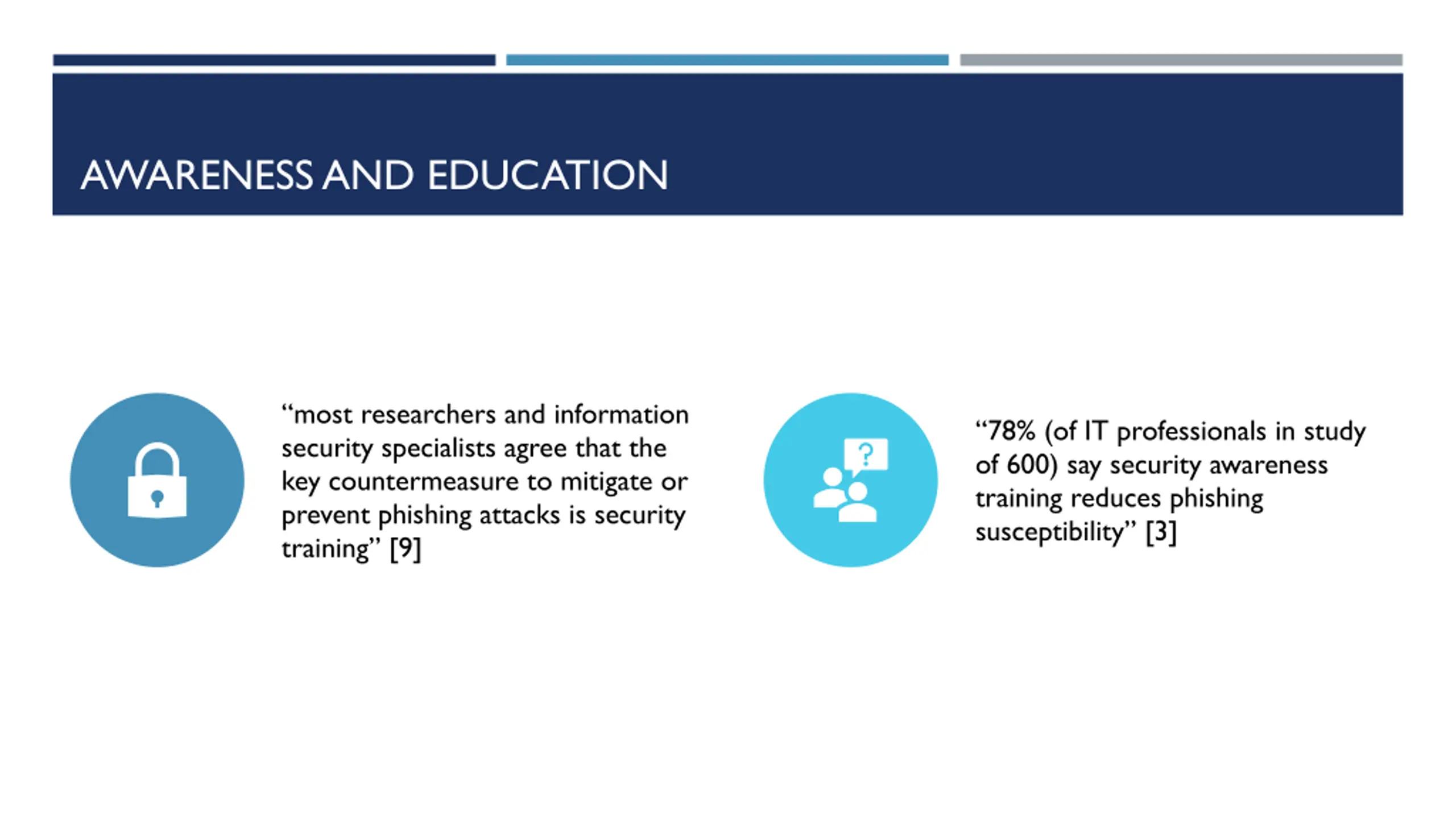 AWARENESS AND EDUCATION most researchers and information security specialists agree that the key countermeasure to mitigate or prevent phishing attacks is security training [9] 78% (of IT professionals in study of 600) say security awareness training reduces phishing susceptibility [3]