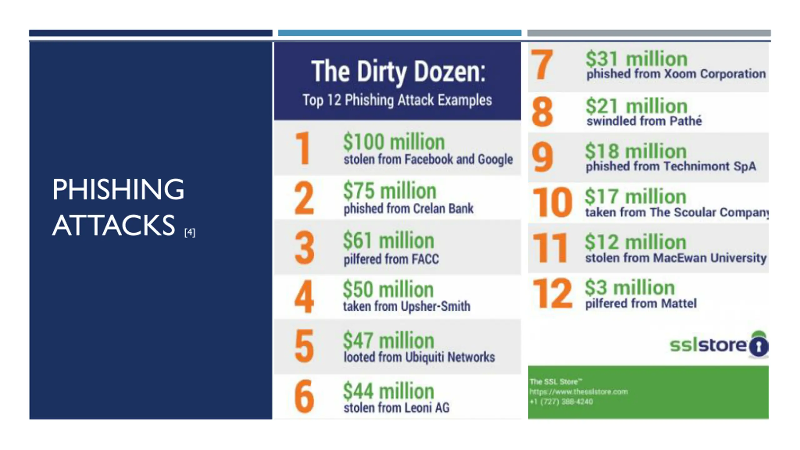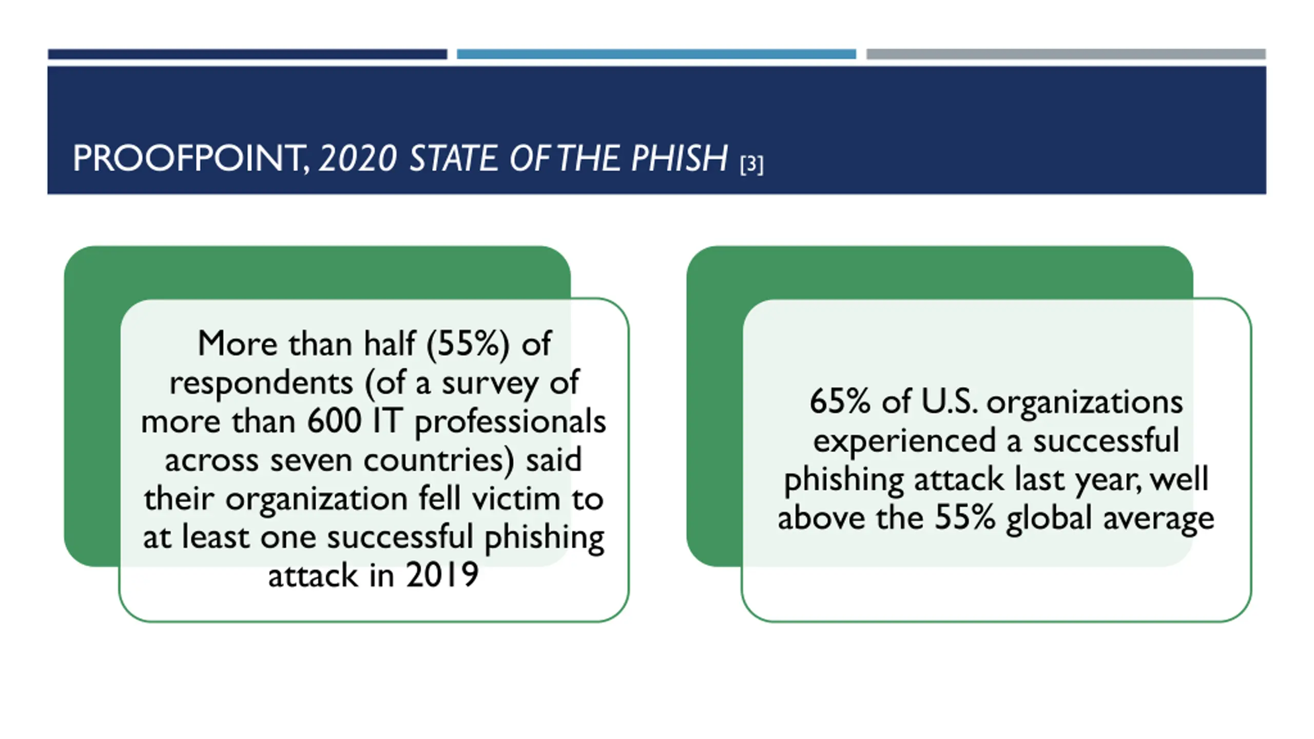 PROOFPOINT, 2020 STATE OF THE PHISH [3] More than half (55%) of respondents (of a survey of more than 600 IT professionals across seven countries) said their organization fell victim to at least one successful phishing attack in 2019 65% of U.S. organizations experienced a successful phishing attack last year, well above the 55% global average