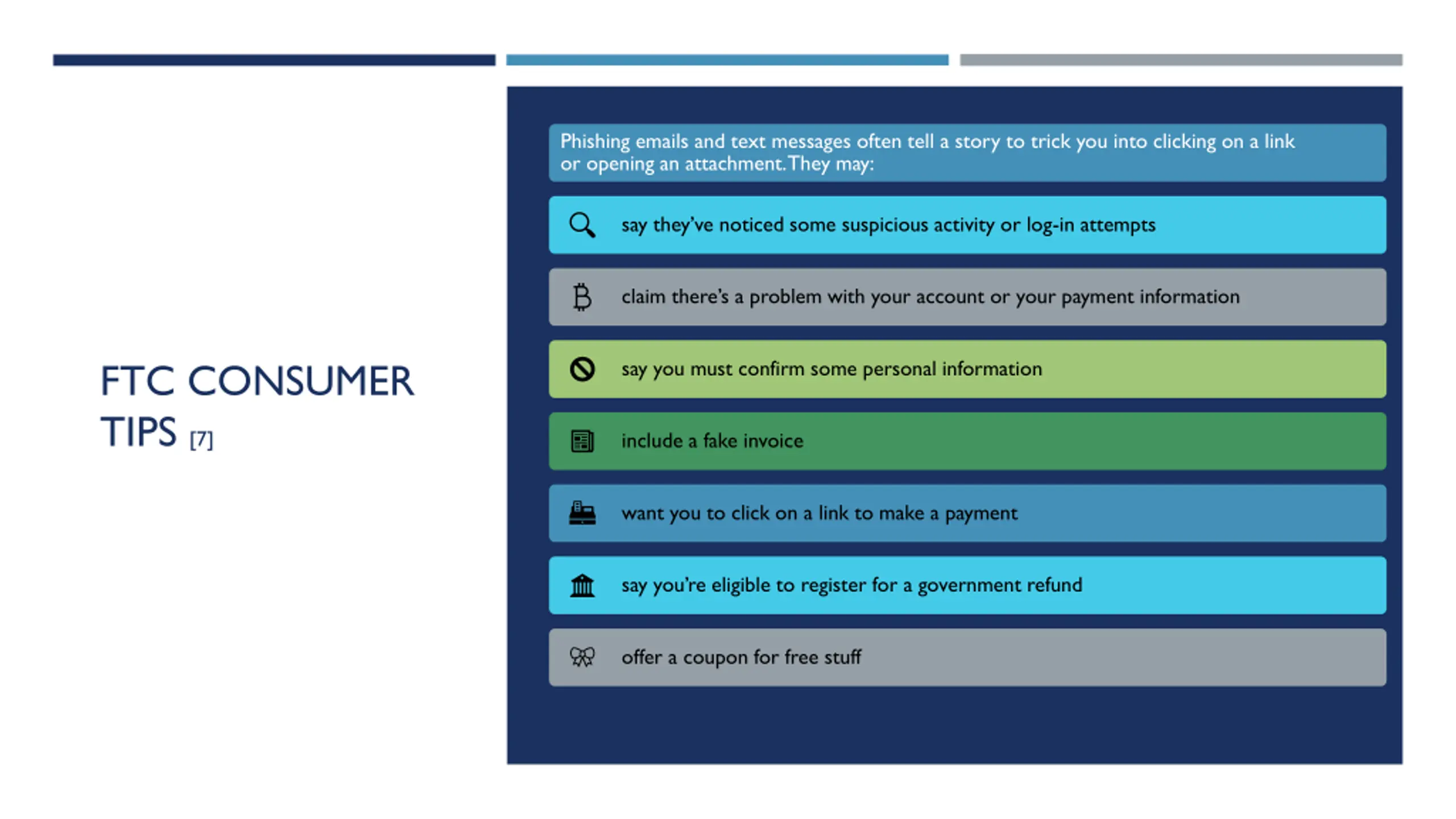 Phishing emails and text messages often tell a story to trick you into clicking on a link or opening an attachment. They may: say they ve noticed some suspicious activity or log-in attempts claim there s a problem with your account or your payment information say you must confirm some personal information FTC CONSUMER TIPS [7] include a fake invoice want you to click on a link to make a payment say you re eligible to register for a government refund offer a coupon for free stuff