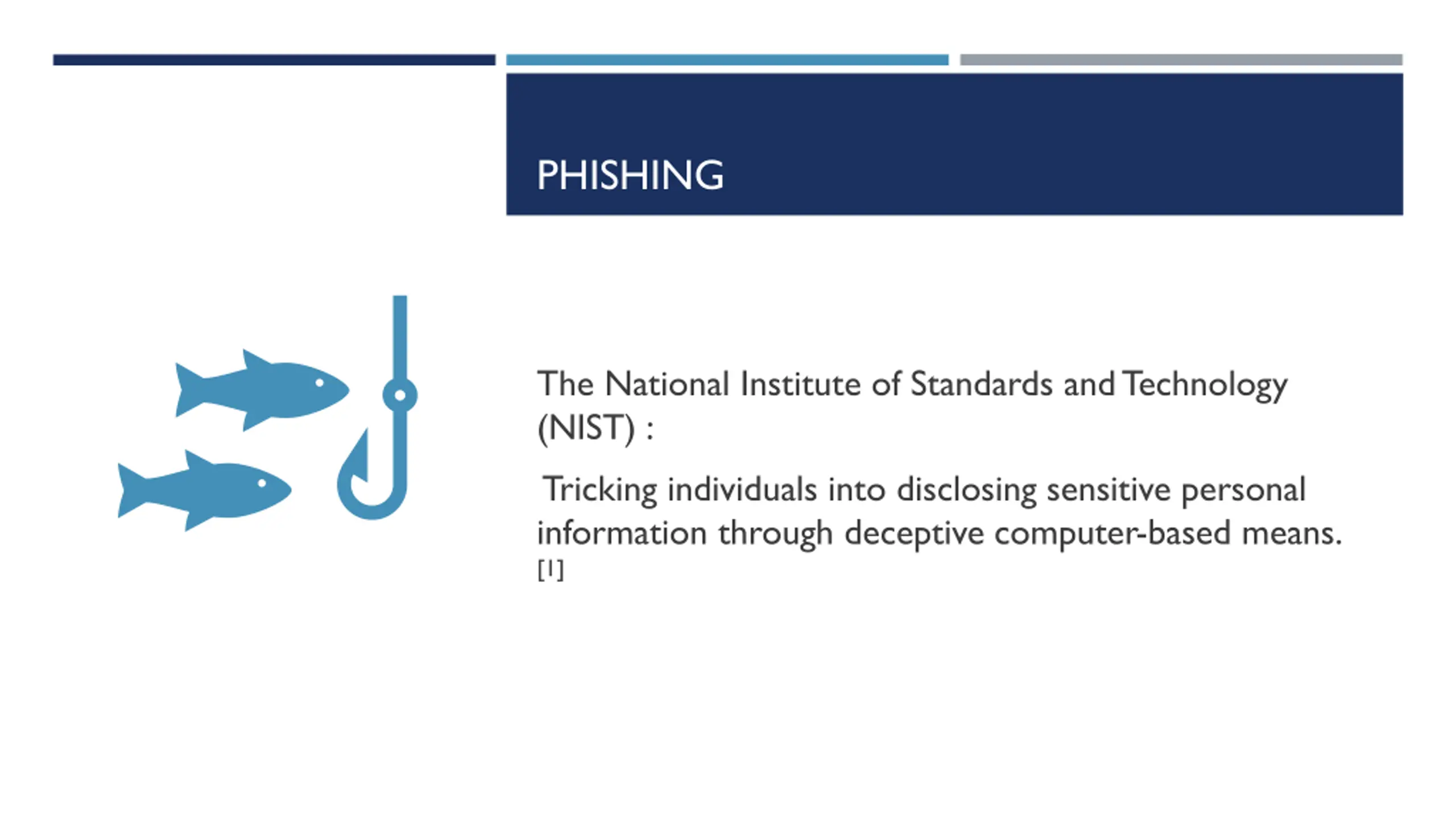 PHISHING The National Institute of Standards and Technology (NIST) : Tricking individuals into disclosing sensitive personal information through deceptive computer-based means. [1]