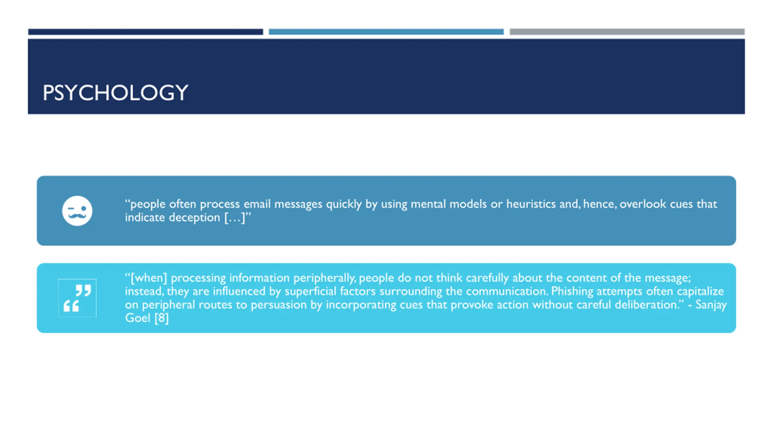 PSYCHOLOGY people often process email messages quickly by using mental models or heuristics and, hence, overlook cues that indicate deception [ ] [when] processing information peripherally, people do not think carefully about the content of the message; instead, they are influenced by superficial factors surrounding the communication. Phishing attempts often capitalize on peripheral routes to persuasion by incorporating cues that provoke action without careful deliberation. - Sanjay Goel [8]