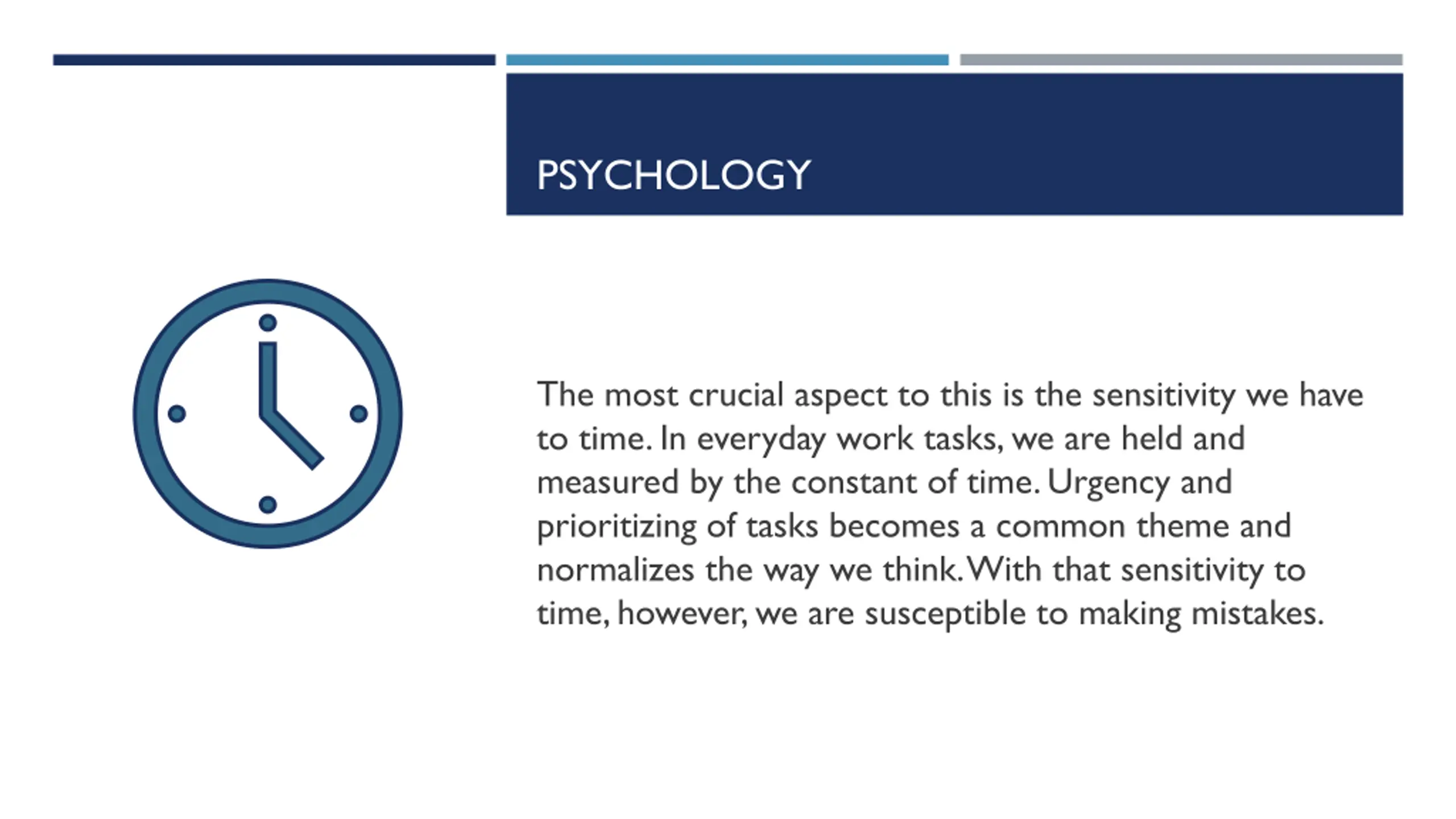 PSYCHOLOGY The most crucial aspect to this is the sensitivity we have to time. In everyday work tasks, we are held and measured by the constant of time. Urgency and prioritizing of tasks becomes a common theme and normalizes the way we think. With that sensitivity to time, however, we are susceptible to making mistakes.