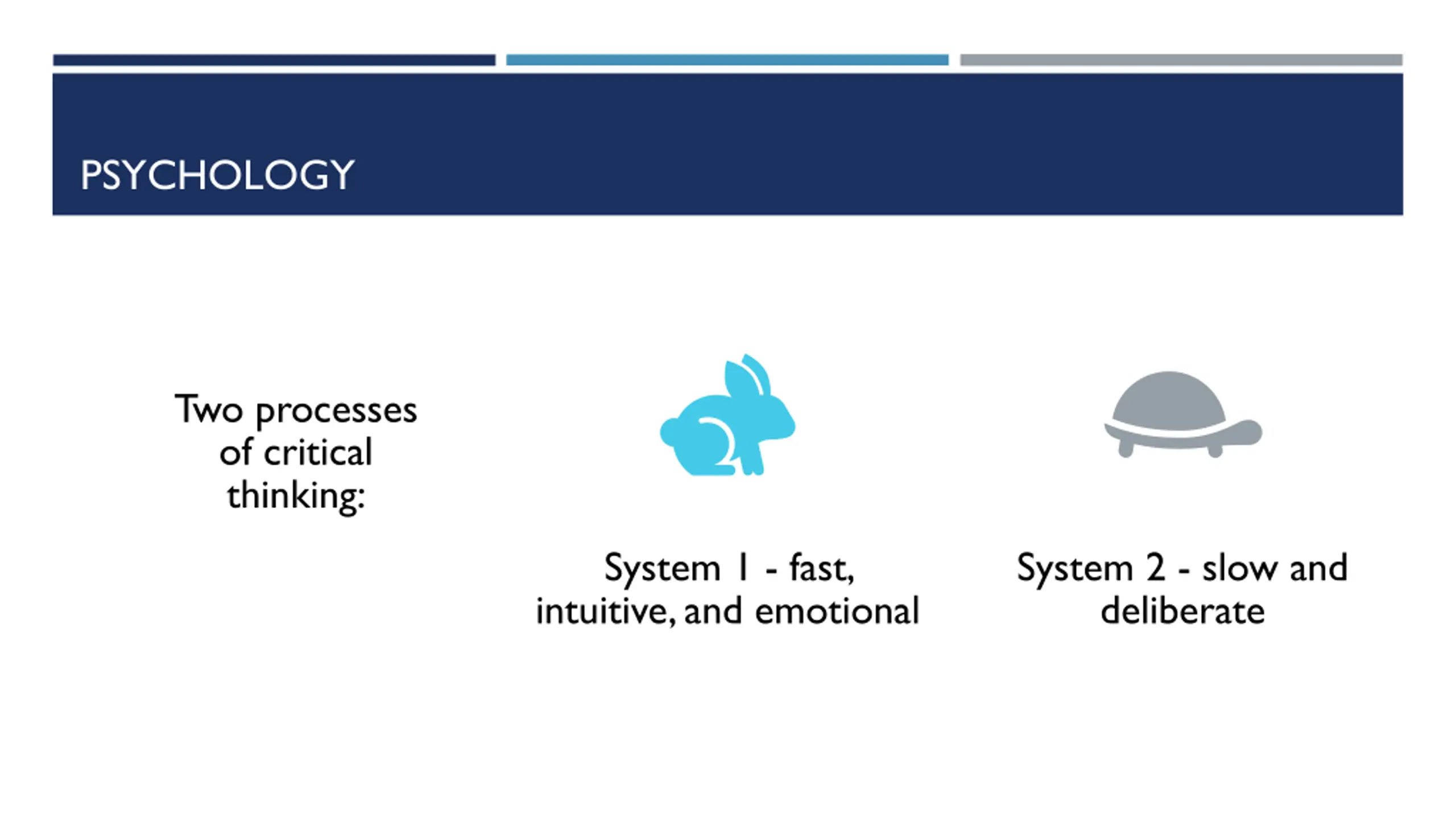 PSYCHOLOGY Two processes of critical thinking: System 1 - fast, intuitive, and emotional System 2 - slow and deliberate
