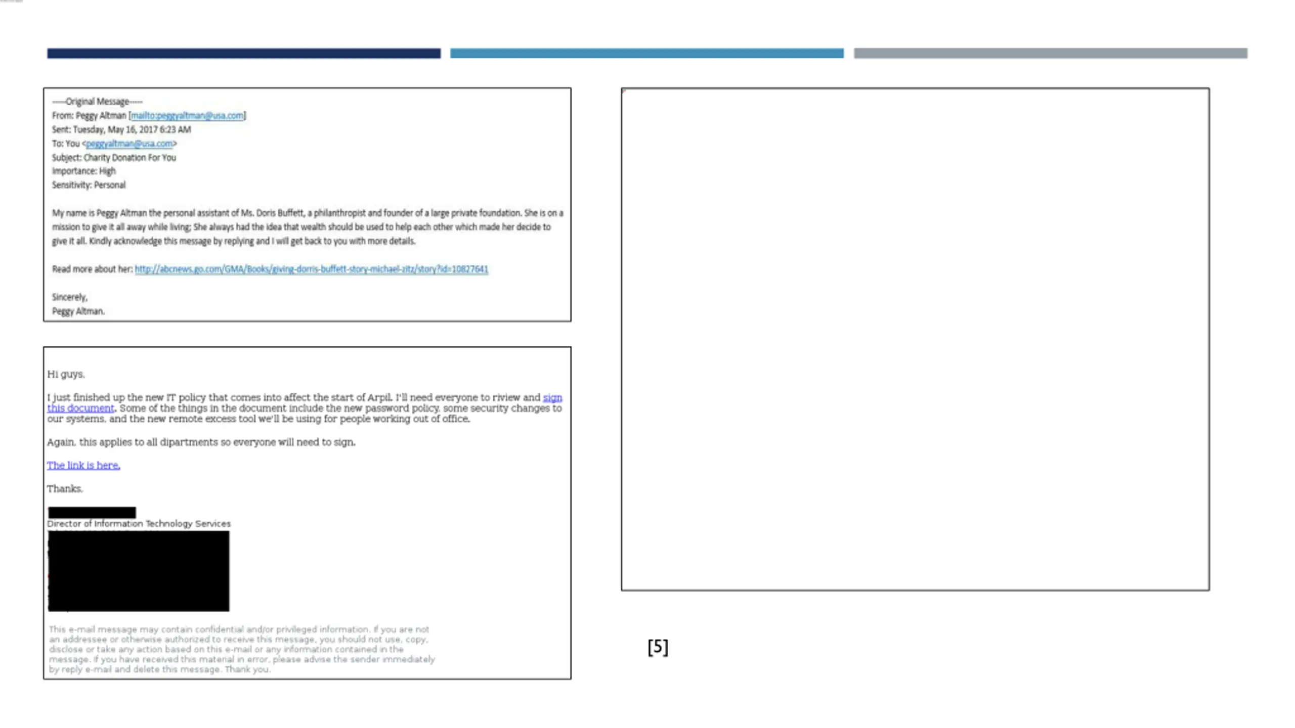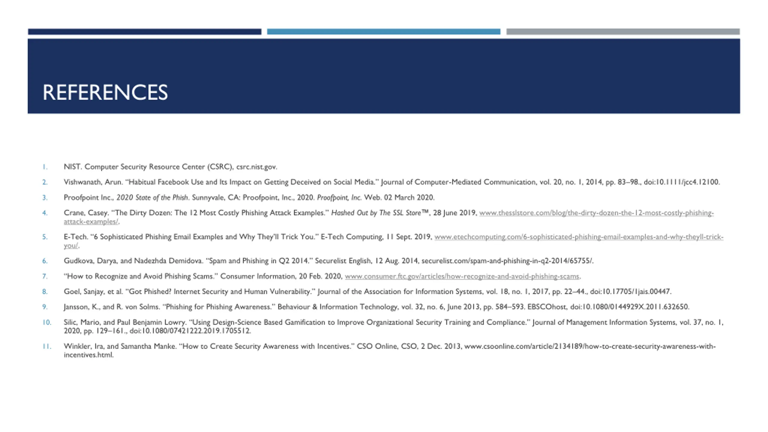 REFERENCES NIST. Computer Security Resource Center (CSRC), csrc.nist.gov. 1. Vishwanath, Arun. Habitual Facebook Use and Its Impact on Getting Deceived on Social Media. Journal of Computer-Mediated Communication, vol. 20, no. 1, 2014, pp. 83 98., doi:10.1111/jcc4.12100. 2. Proofpoint Inc., 2020 State of the Phish. Sunnyvale, CA: Proofpoint, Inc., 2020. Proofpoint, Inc. Web. 02 March 2020. 3. Crane, Casey. The Dirty Dozen: The 12 Most Costly Phishing Attack Examples. Hashed Out by The SSL Store attack-examples/. , 28 June 2019, www.thesslstore.com/blog/the-dirty-dozen-the-12-most-costly-phishing- 4. E-Tech. 6 Sophisticated Phishing Email Examples and Why They ll Trick You. E-Tech Computing, 11 Sept. 2019, www.etechcomputing.com/6-sophisticated-phishing-email-examples-and-why-theyll-trick- you/. 5. Gudkova, Darya, and Nadezhda Demidova. Spam and Phishing in Q2 2014. Securelist English, 12 Aug. 2014, securelist.com/spam-and-phishing-in-q2-2014/65755/. 6. How to Recognize and Avoid Phishing Scams. Consumer Information, 20 Feb. 2020, www.consumer.ftc.gov/articles/how-recognize-and-avoid-phishing-scams. 7. Goel, Sanjay, et al. Got Phished? Internet Security and Human Vulnerability. Journal of the Association for Information Systems, vol. 18, no. 1, 2017, pp. 22 44., doi:10.17705/1jais.00447. 8. Jansson, K., and R. von Solms. Phishing for Phishing Awareness. Behaviour & Information Technology, vol. 32, no. 6, June 2013, pp. 584 593. EBSCOhost, doi:10.1080/0144929X.2011.632650. 9. Silic, Mario, and Paul Benjamin Lowry. Using Design-Science Based Gamification to Improve Organizational Security Training and Compliance. Journal of Management Information Systems, vol. 37, no. 1, 2020, pp. 129 161., doi:10.1080/07421222.2019.1705512. 10. Winkler, Ira, and Samantha Manke. How to Create Security Awareness with Incentives. CSO Online, CSO, 2 Dec. 2013, www.csoonline.com/article/2134189/how-to-create-security-awareness-with- incentives.html. 11.