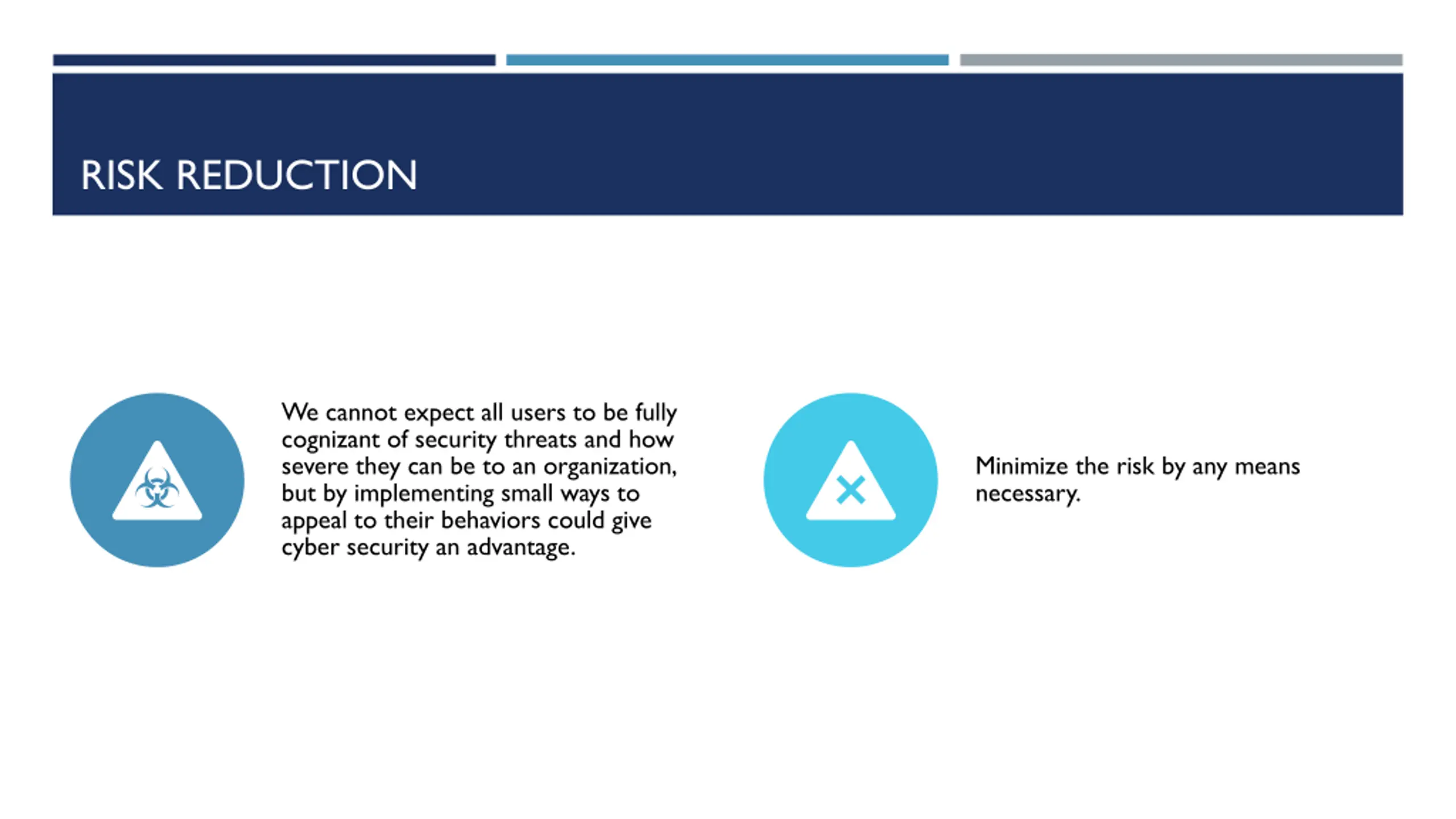 RISK REDUCTION We cannot expect all users to be fully cognizant of security threats and how severe they can be to an organization, but by implementing small ways to appeal to their behaviors could give cyber security an advantage. Minimize the risk by any means necessary.