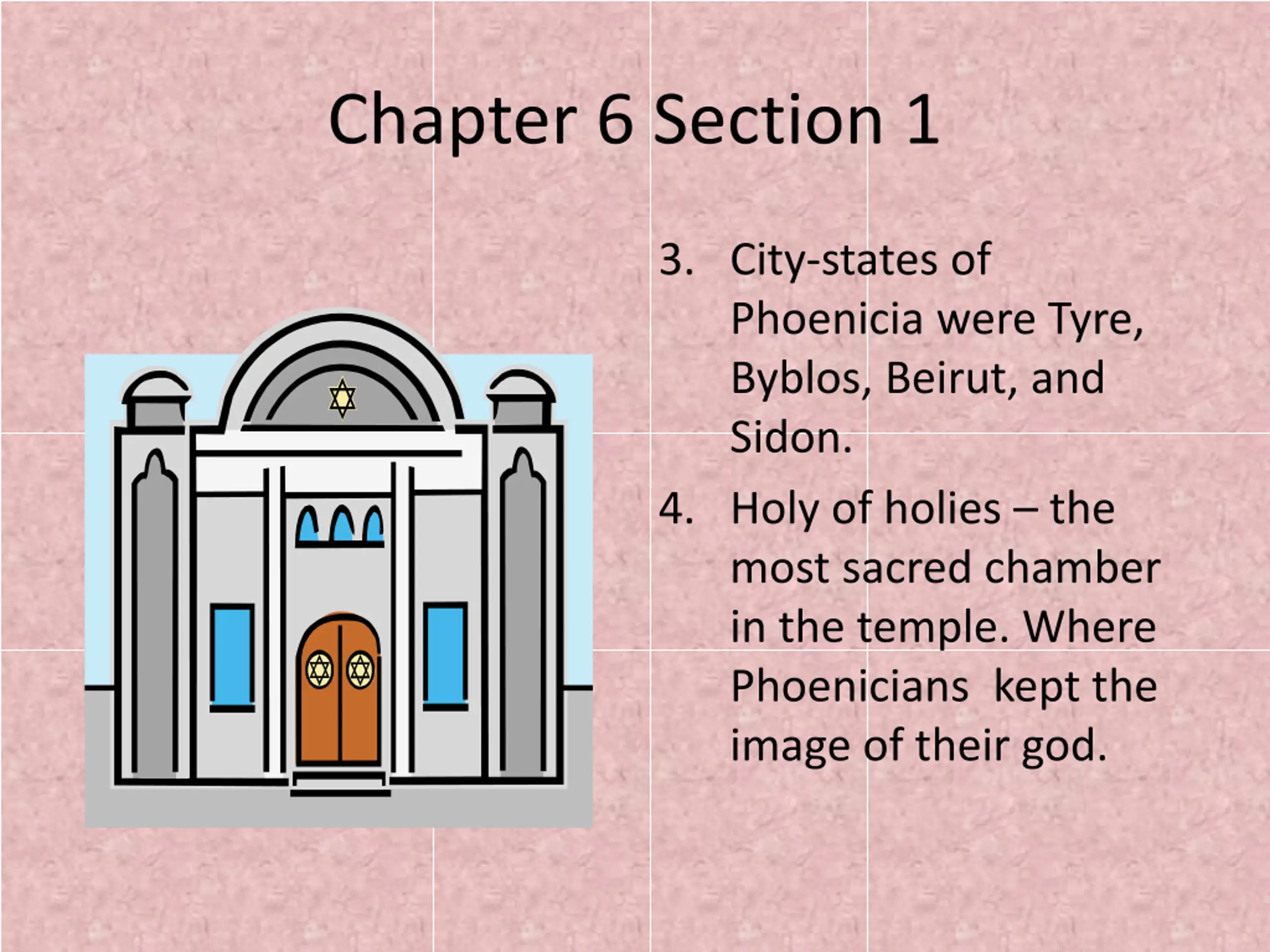Chapter 6 Section 1 3. City-states of Phoenicia were Tyre, Byblos, Beirut, and Sidon. 4. Holy of holies the most sacred chamber in the temple. Where Phoenicians kept the image of their god.
