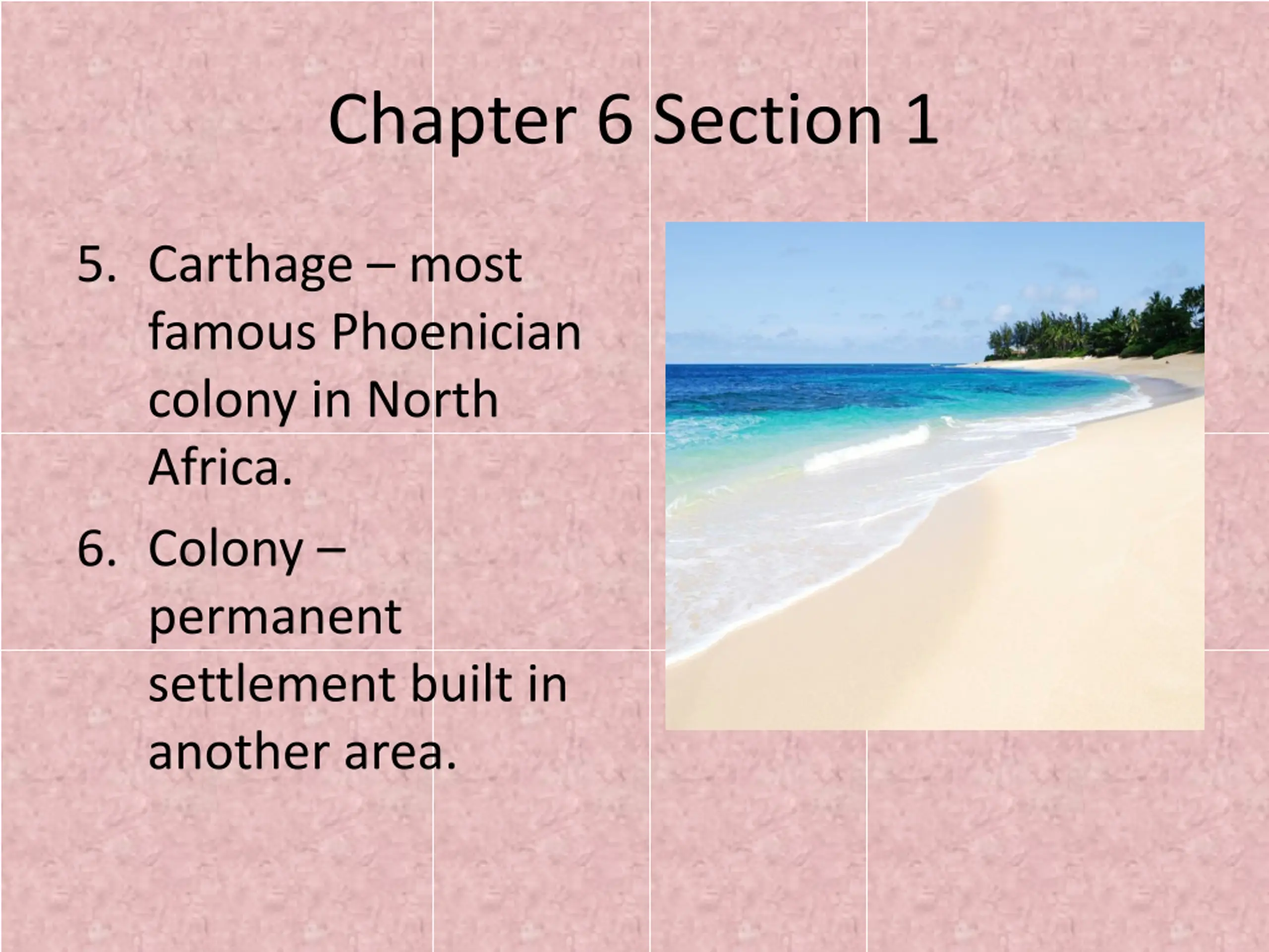 Chapter 6 Section 1 5. Carthage most famous Phoenician colony in North Africa. 6. Colony permanent settlement built in another area.