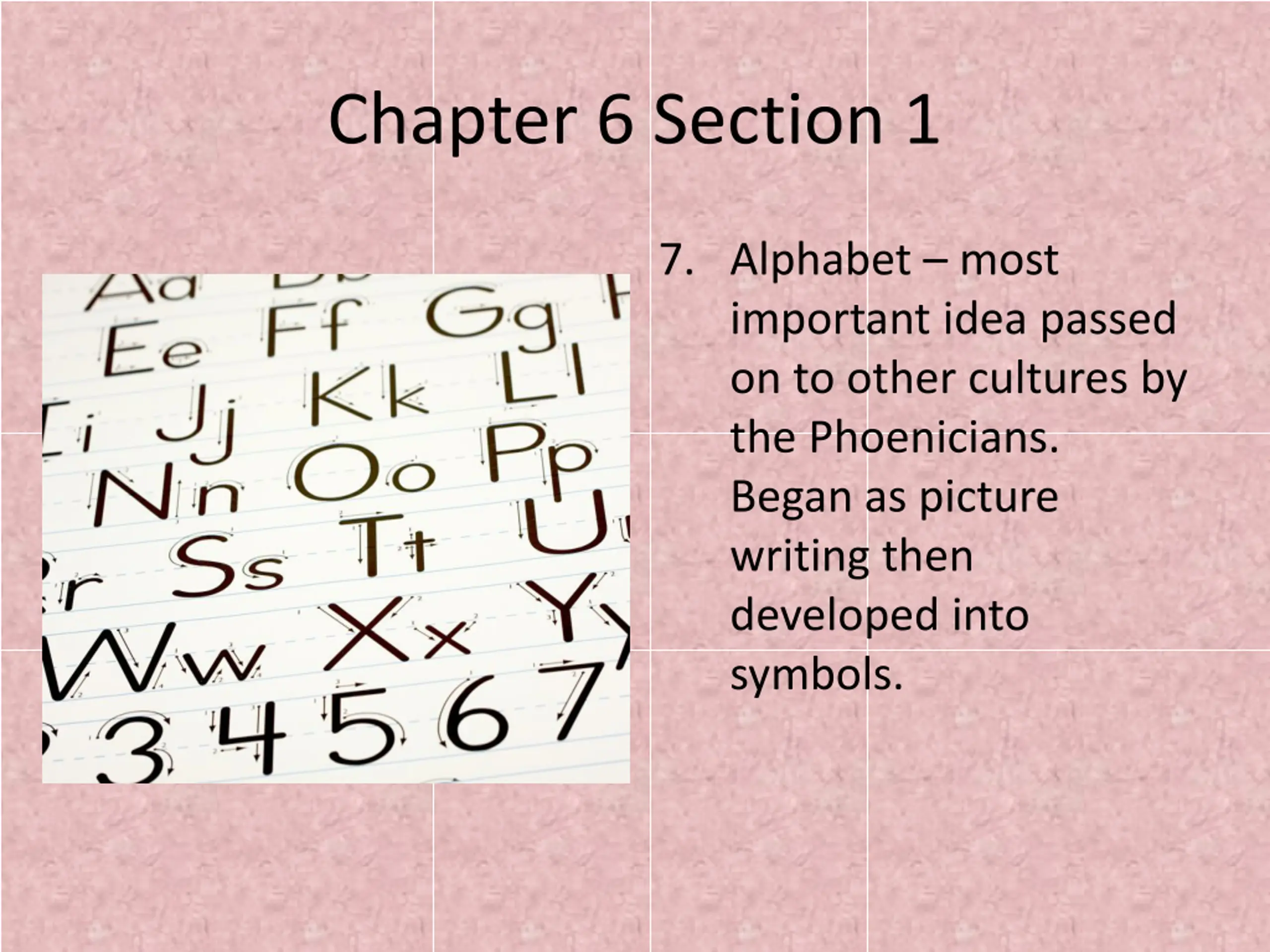 Chapter 6 Section 1 7. Alphabet most important idea passed on to other cultures by the Phoenicians. Began as picture writing then developed into symbols.