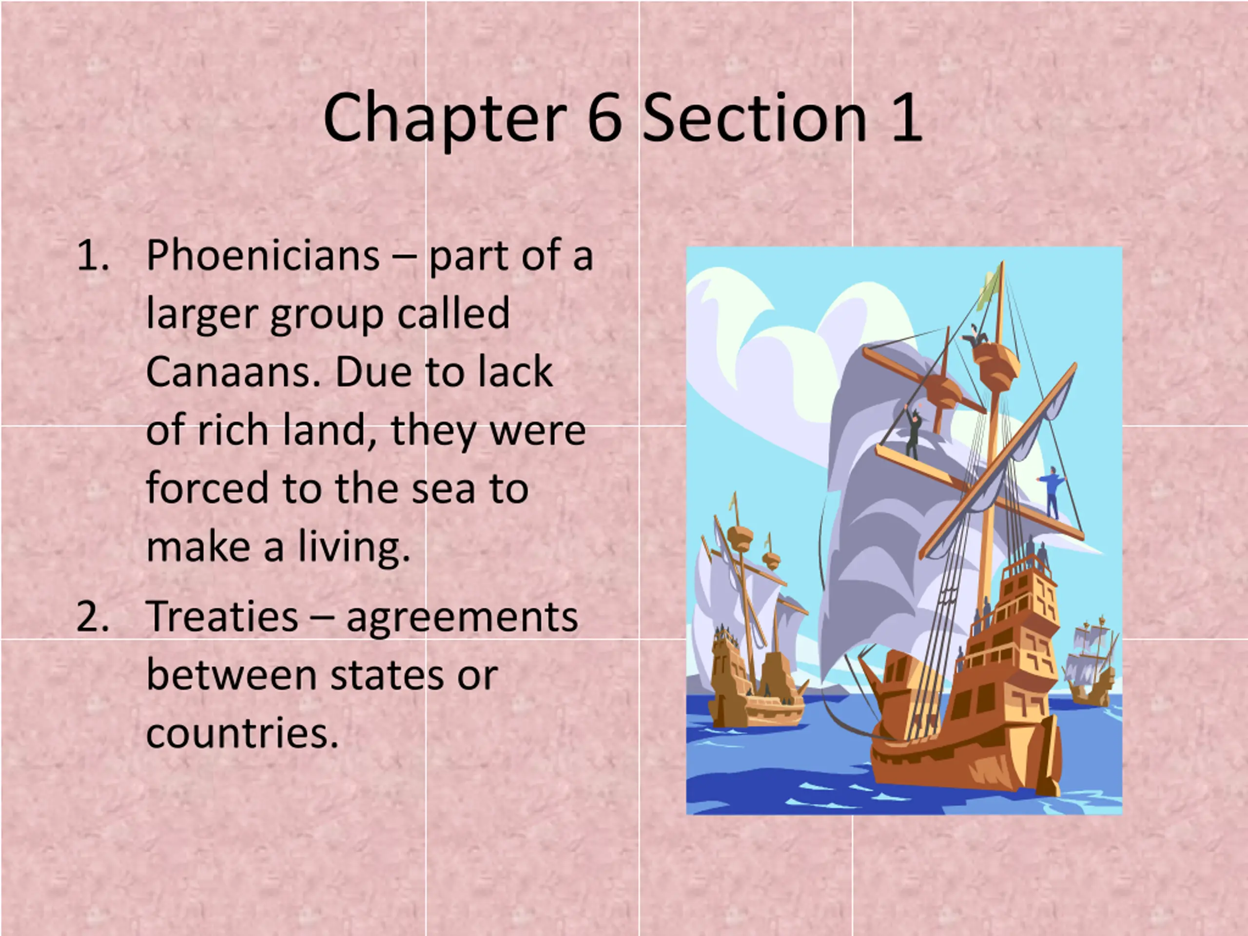 Chapter 6 Section 1 1. Phoenicians part of a larger group called Canaans. Due to lack of rich land, they were forced to the sea to make a living. 2. Treaties agreements between states or countries.