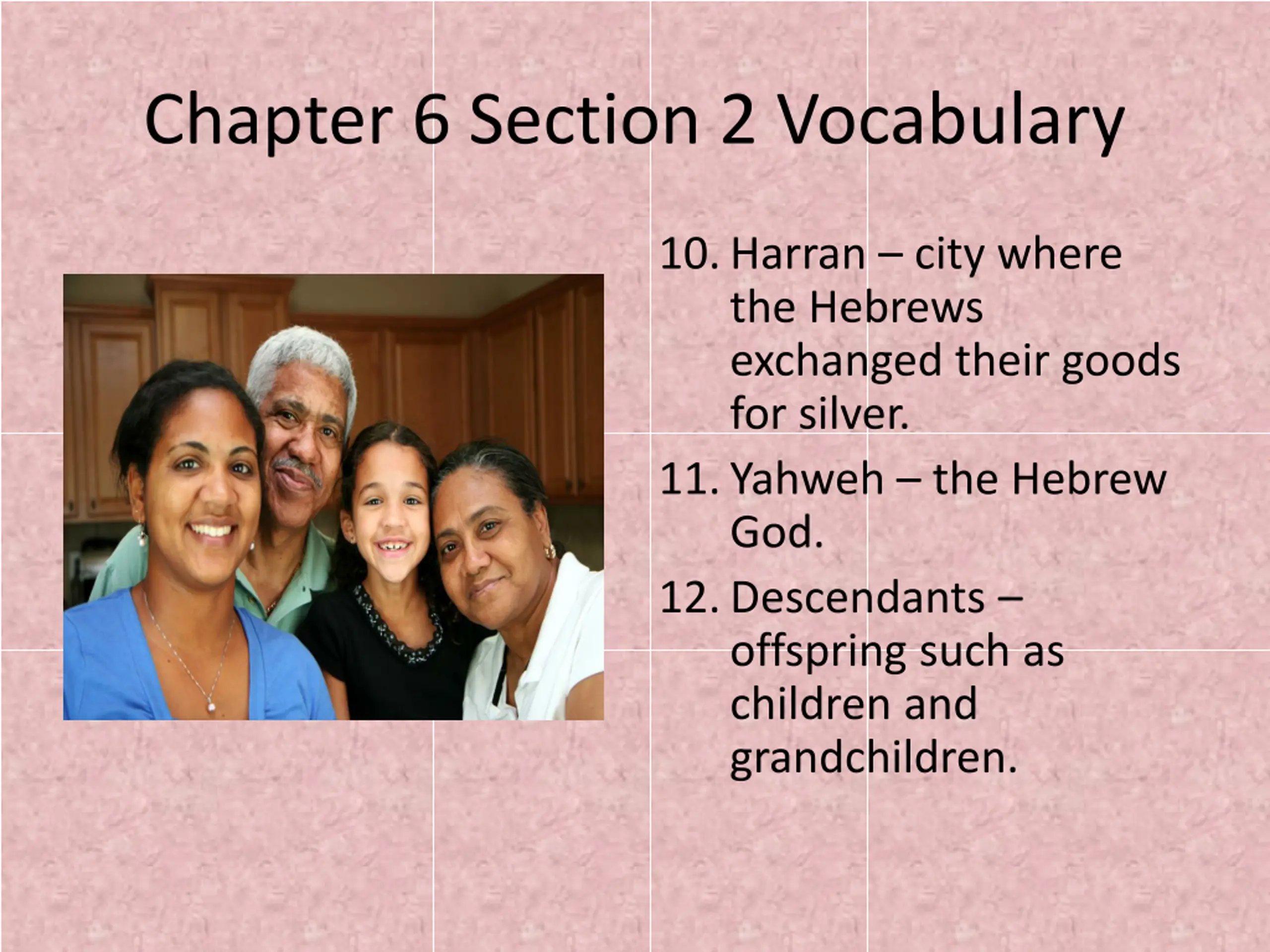 Chapter 6 Section 2 Vocabulary 10.Harran city where the Hebrews exchanged their goods for silver. 11.Yahweh the Hebrew God. 12.Descendants offspring such as children and grandchildren.
