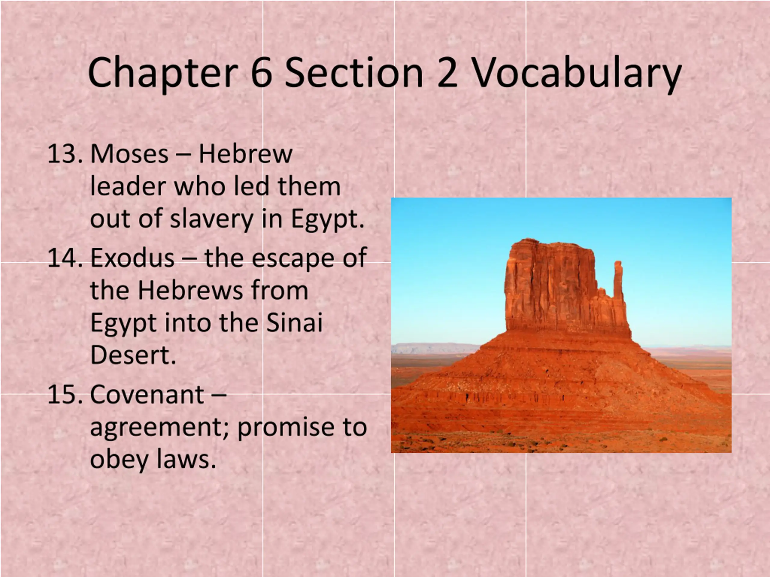Chapter 6 Section 2 Vocabulary 13.Moses Hebrew leader who led them out of slavery in Egypt. 14.Exodus the escape of the Hebrews from Egypt into the Sinai Desert. 15.Covenant agreement; promise to obey laws.