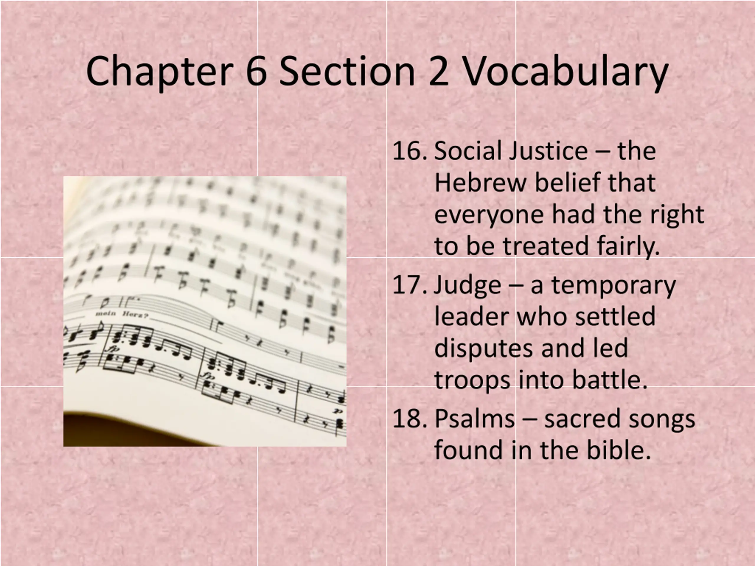 Chapter 6 Section 2 Vocabulary 16.Social Justice the Hebrew belief that everyone had the right to be treated fairly. 17.Judge a temporary leader who settled disputes and led troops into battle. 18.Psalms sacred songs found in the bible.