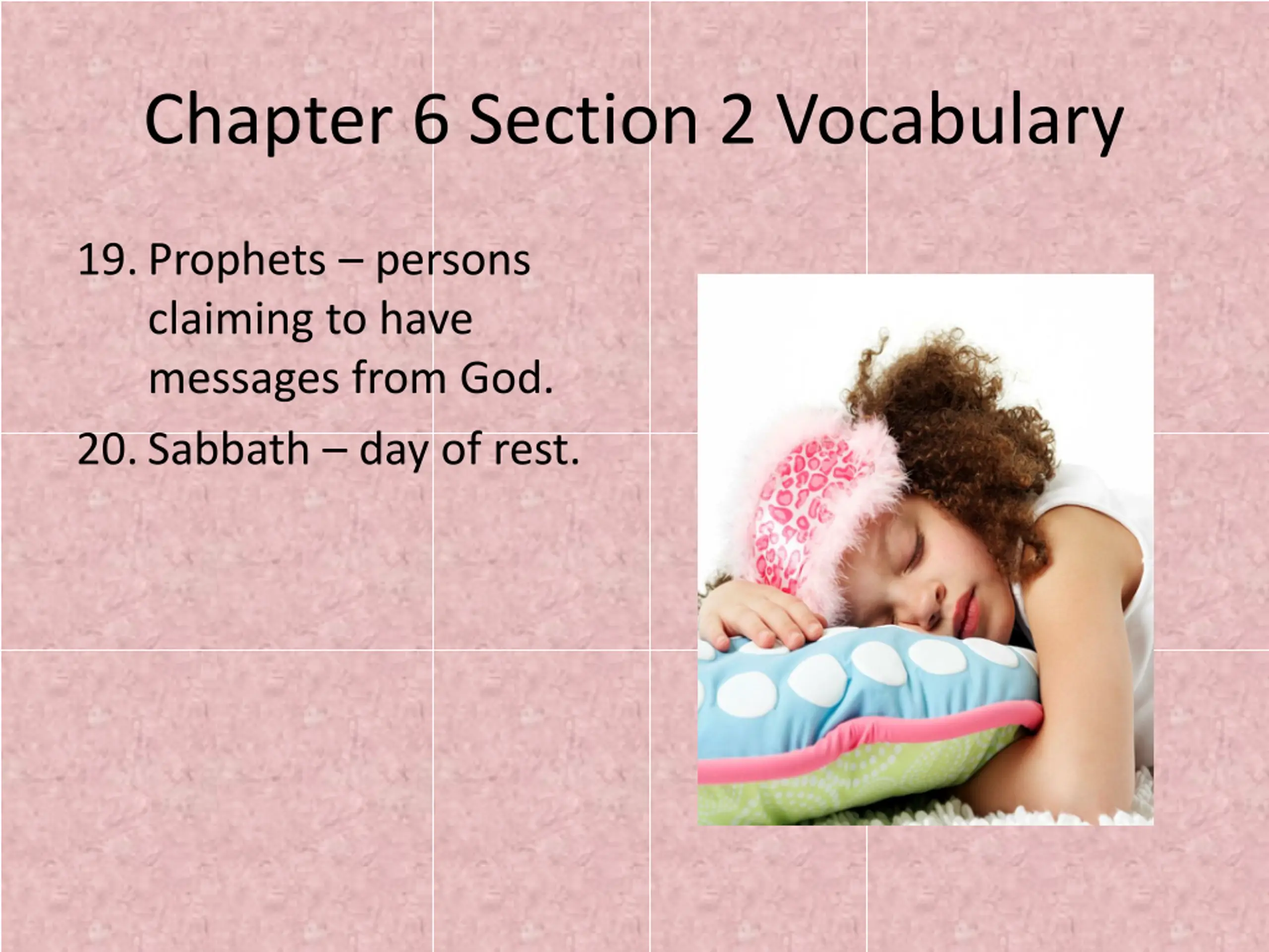 Chapter 6 Section 2 Vocabulary 19.Prophets persons claiming to have messages from God. 20.Sabbath day of rest.
