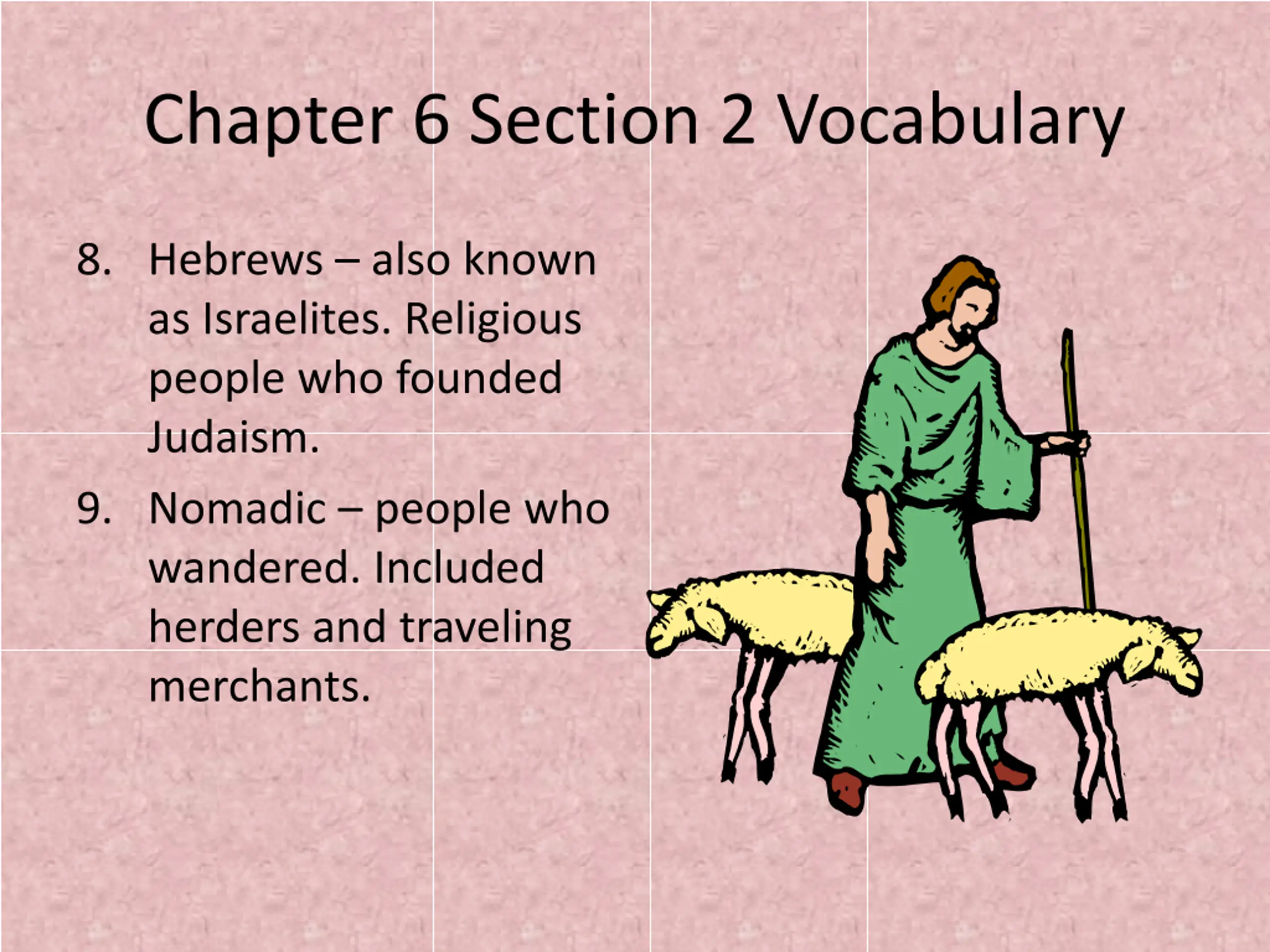 Chapter 6 Section 2 Vocabulary 8. Hebrews also known as Israelites. Religious people who founded Judaism. 9. Nomadic people who wandered. Included herders and traveling merchants.