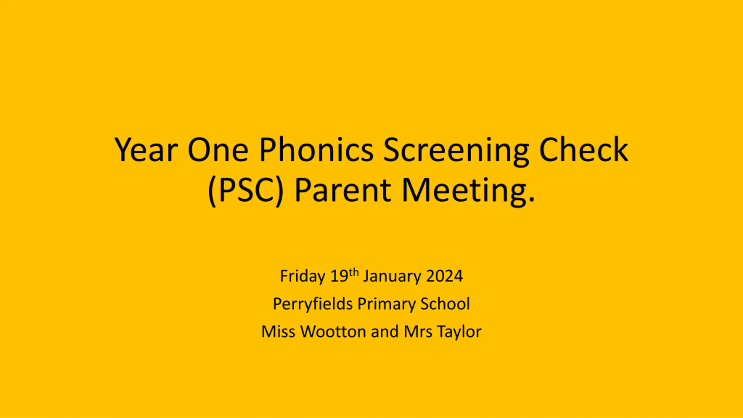 Year One Phonics Screening Check (PSC) Parent Meeting. Friday 19thJanuary 2024 Perryfields Primary School Miss Wootton and Mrs Taylor