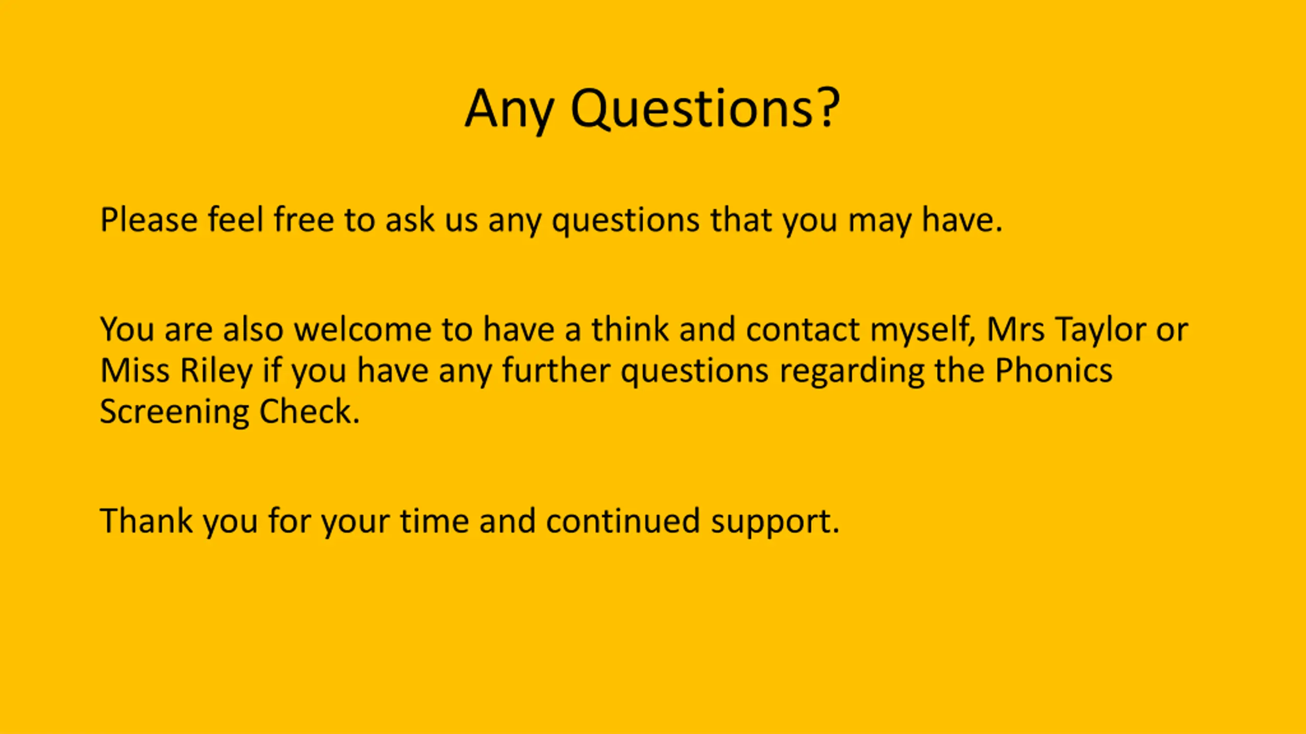 Any Questions? Please feel free to ask us any questions that you may have. You are also welcome to have a think and contact myself, Mrs Taylor or Miss Riley if you have any further questions regarding the Phonics Screening Check. Thank you for your time and continued support.