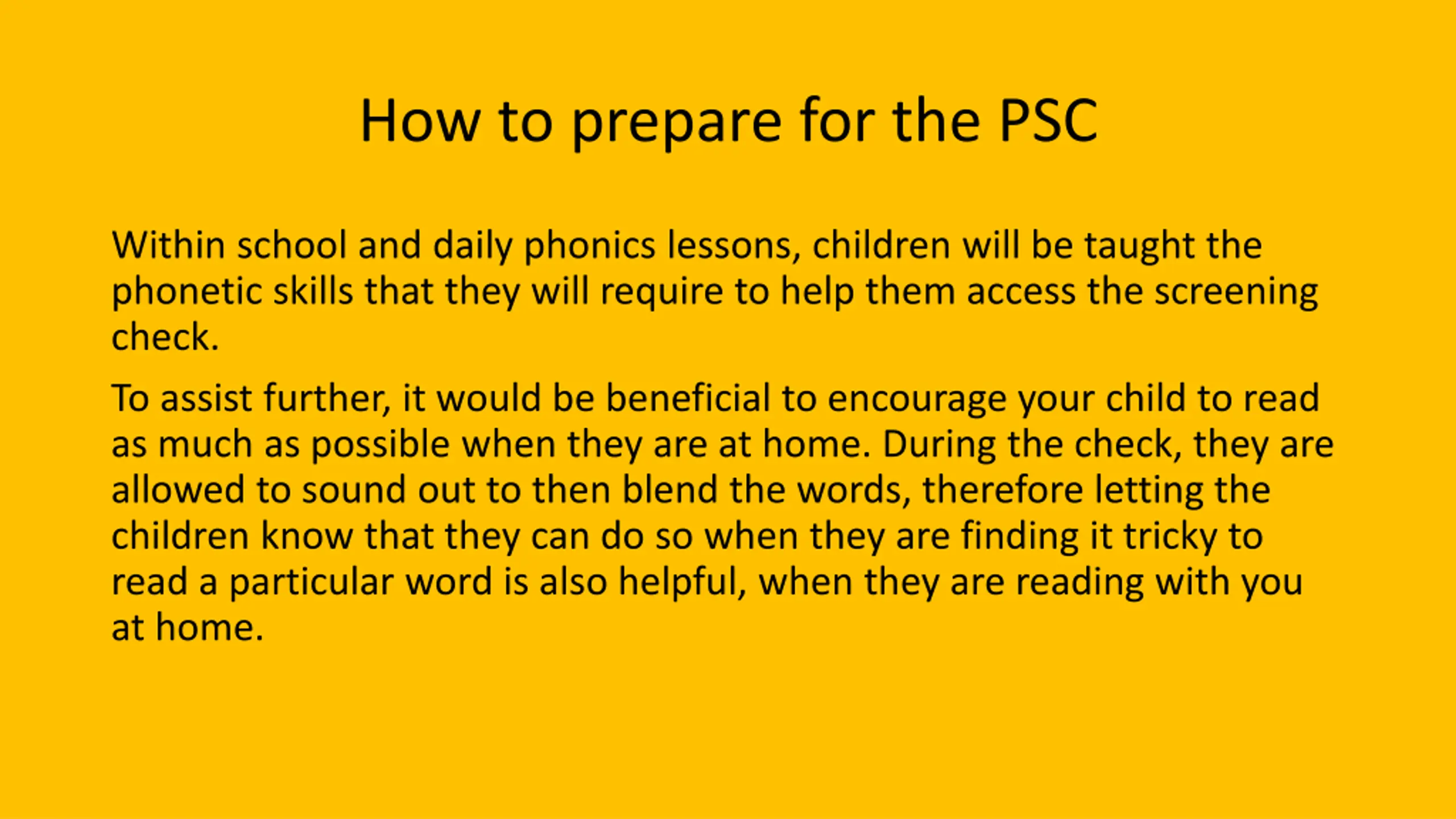 How to prepare for the PSC Within school and daily phonics lessons, children will be taught the phonetic skills that they will require to help them access the screening check. To assist further, it would be beneficial to encourage your child to read as much as possible when they are at home. During the check, they are allowed to sound out to then blend the words, therefore letting the children know that they can do so when they are finding it tricky to read a particular word is also helpful, when they are reading with you at home.