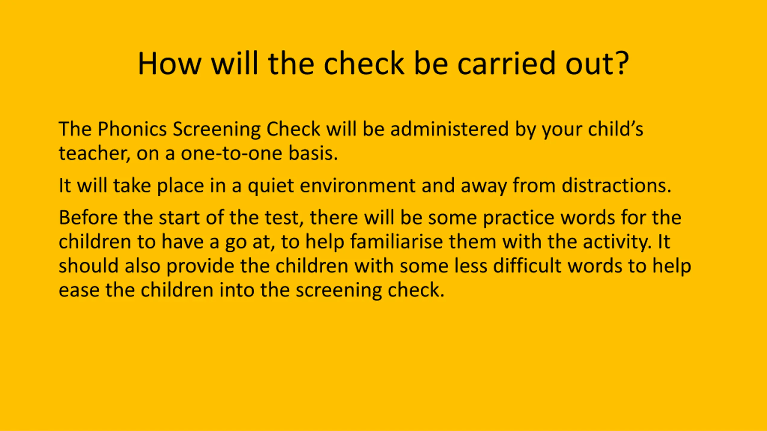 How will the check be carried out? The Phonics Screening Check will be administered by your child s teacher, on a one-to-one basis. It will take place in a quiet environment and away from distractions. Before the start of the test, there will be some practice words for the children to have a go at, to help familiarise them with the activity. It should also provide the children with some less difficult words to help ease the children into the screening check.