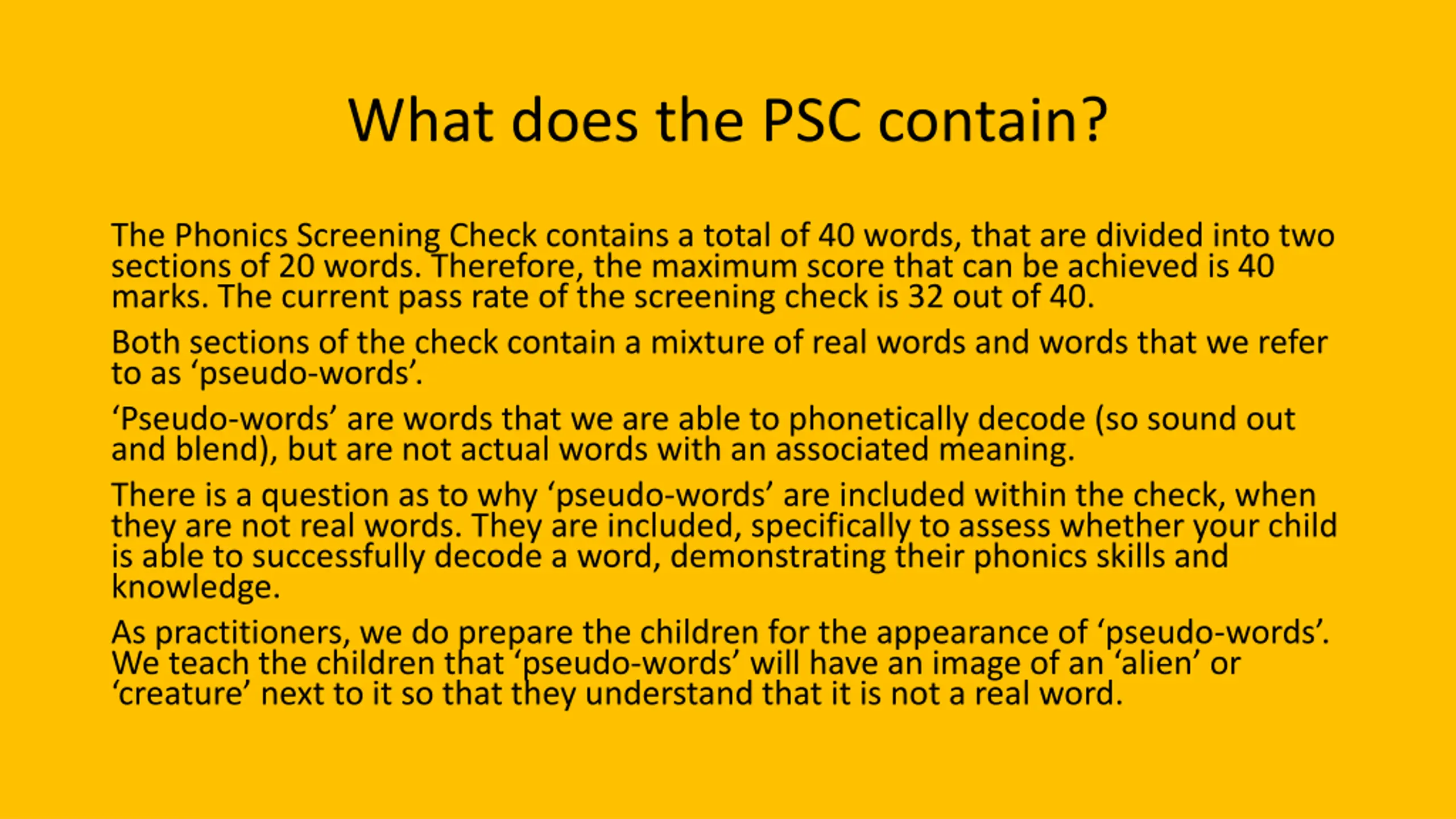 What does the PSC contain? The Phonics Screening Check contains a total of 40 words, that are divided into two sections of 20 words. Therefore, the maximum score that can be achieved is 40 marks. The current pass rate of the screening check is 32 out of 40. Both sections of the check contain a mixture of real words and words that we refer to as pseudo-words . Pseudo-words are words that we are able to phonetically decode (so sound out and blend), but are not actual words with an associated meaning. There is a question as to why pseudo-words are included within the check, when they are not real words. They are included, specifically to assess whether your child is able to successfully decode a word, demonstrating their phonics skills and knowledge. As practitioners, we do prepare the children for the appearance of pseudo-words . We teach the children that pseudo-words will have an image of an alien or creature next to it so that they understand that it is not a real word.