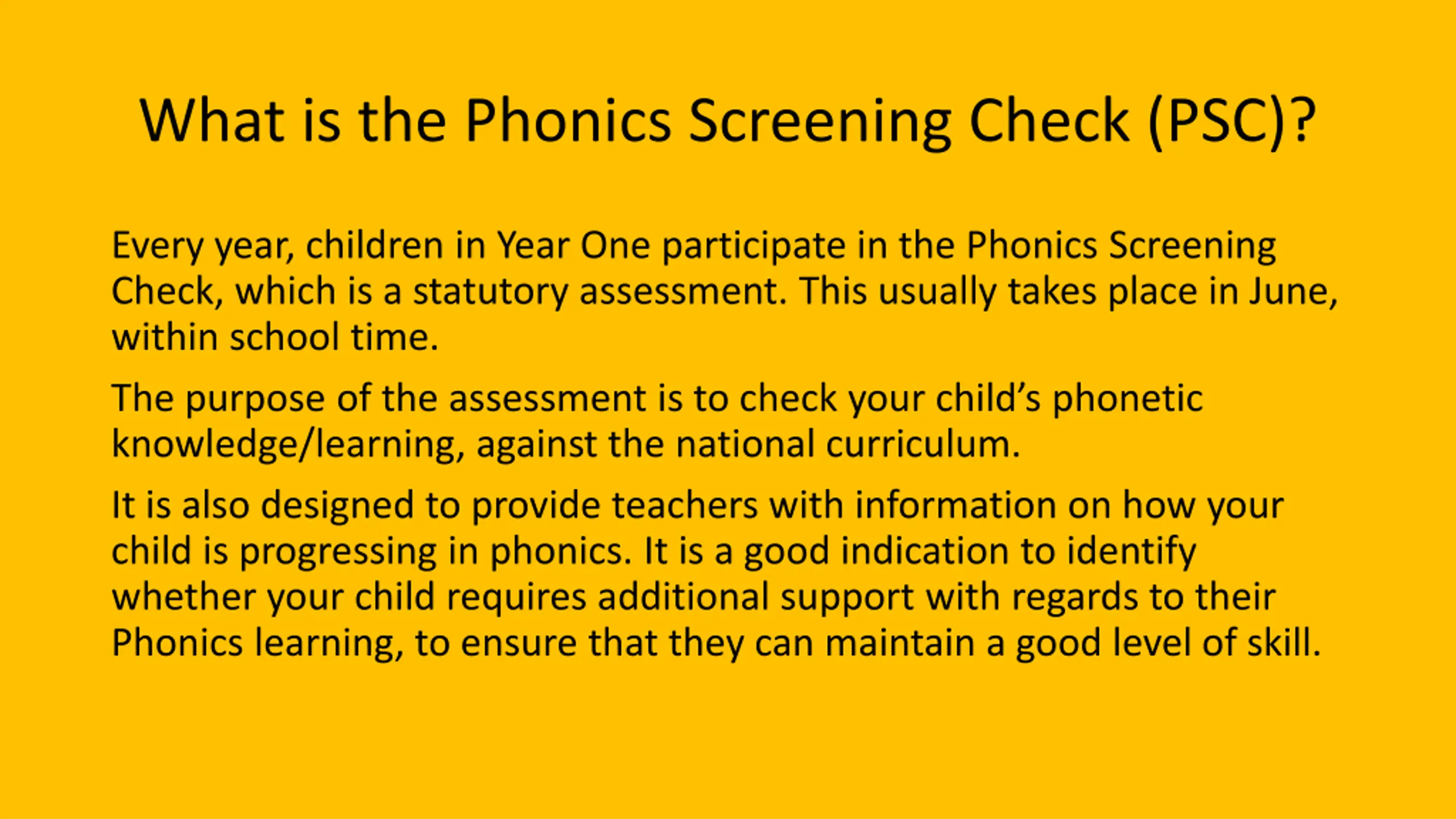 What is the Phonics Screening Check (PSC)? Every year, children in Year One participate in the Phonics Screening Check, which is a statutory assessment. This usually takes place in June, within school time. The purpose of the assessment is to check your child s phonetic knowledge/learning, against the national curriculum. It is also designed to provide teachers with information on how your child is progressing in phonics. It is a good indication to identify whether your child requires additional support with regards to their Phonics learning, to ensure that they can maintain a good level of skill.