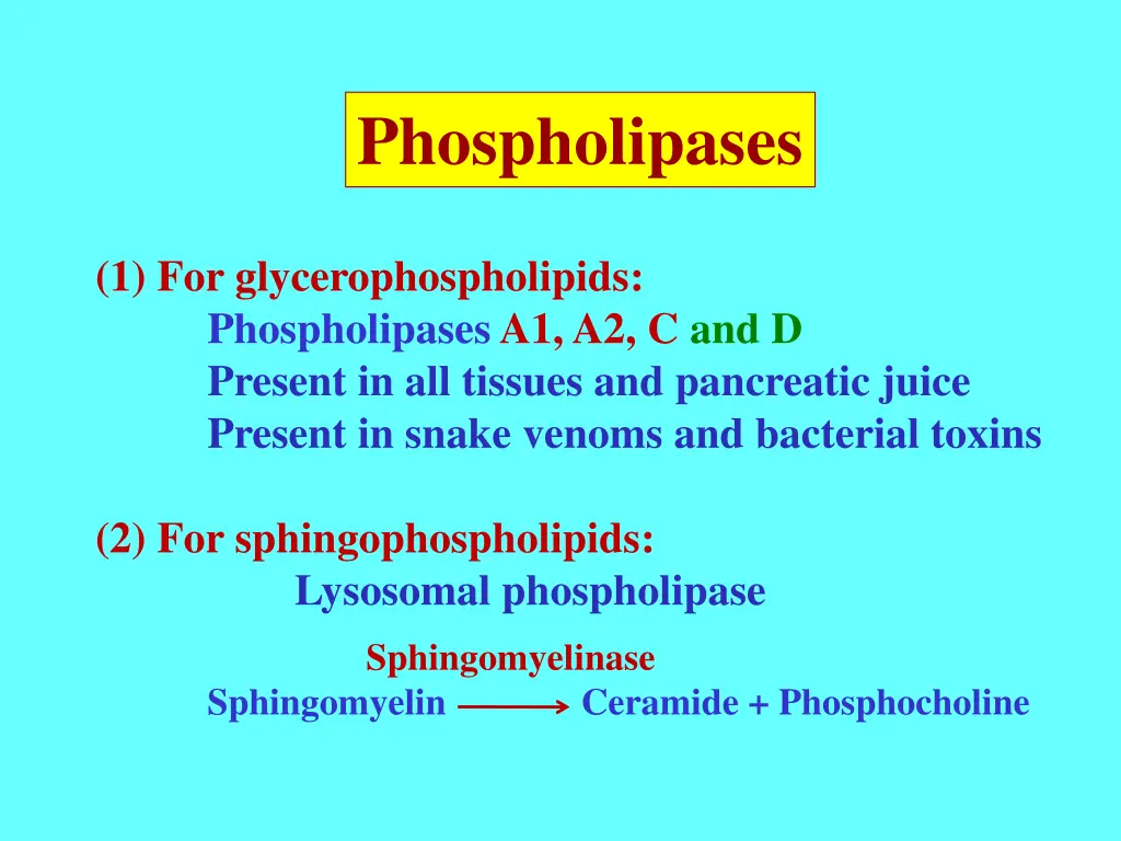 Phospholipases (1) For glycerophospholipids: Phospholipases A1, A2, C and D Present in all tissues and pancreatic juice Present in snake venoms and bacterial toxins (2) For sphingophospholipids: Lysosomal phospholipase Sphingomyelin Sphingomyelinase Ceramide + Phosphocholine