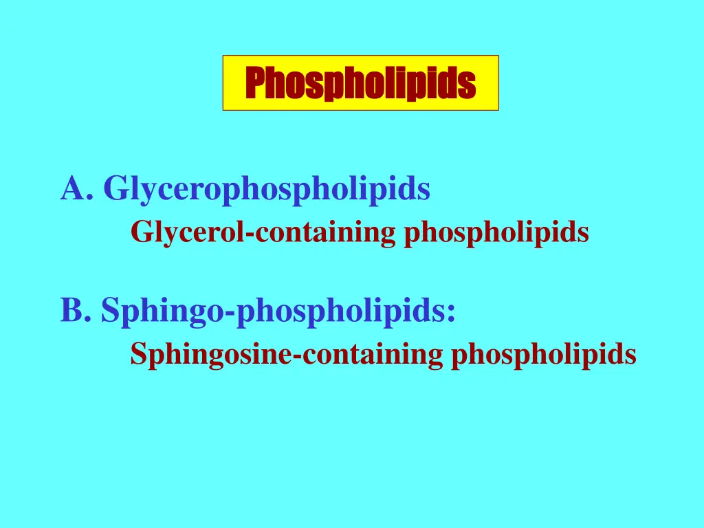 Phospholipids Phospholipids A. Glycerophospholipids Glycerol-containing phospholipids B. Sphingo-phospholipids: Sphingosine-containing phospholipids