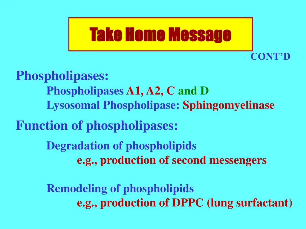 Take Home Message Take Home Message CONT D Phospholipases: Phospholipases A1, A2, C and D Lysosomal Phospholipase: Sphingomyelinase Function of phospholipases: Degradation of phospholipids e.g., production of second messengers Remodeling of phospholipids e.g., production of DPPC (lung surfactant)