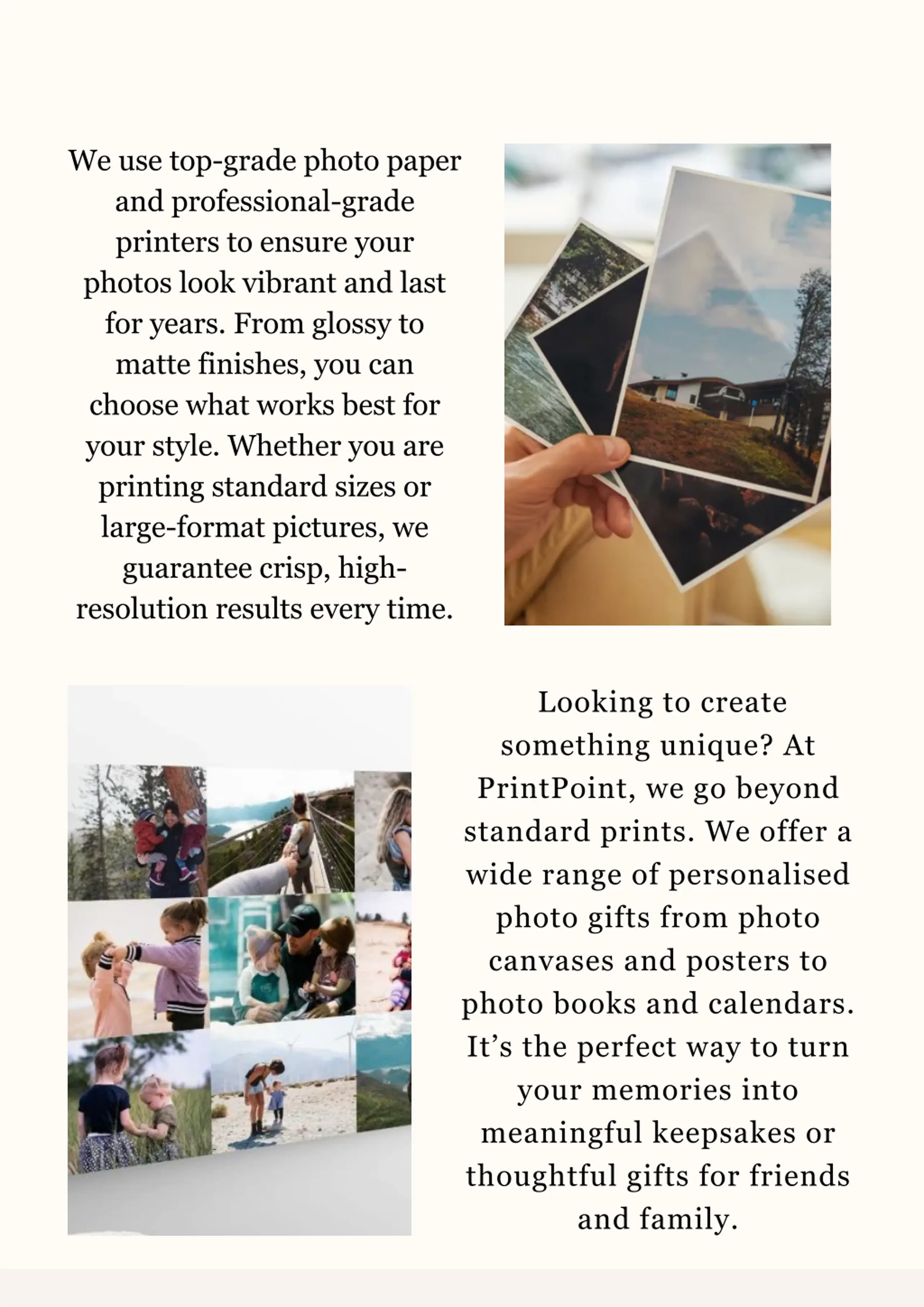 We use top-grade photo paper and professional-grade printers to ensure your photos look vibrant and last for years. From glossy to matte finishes, you can choose what works best for your style. Whether you are printing standard sizes or large-format pictures, we guarantee crisp, high- resolution results every time. Looking to create something unique? At PrintPoint, we go beyond standard prints. We offer a wide range of personalised photo gifts from photo canvases and posters to photo books and calendars. It s the perfect way to turn your memories into meaningful keepsakes or thoughtful gifts for friends and family.
