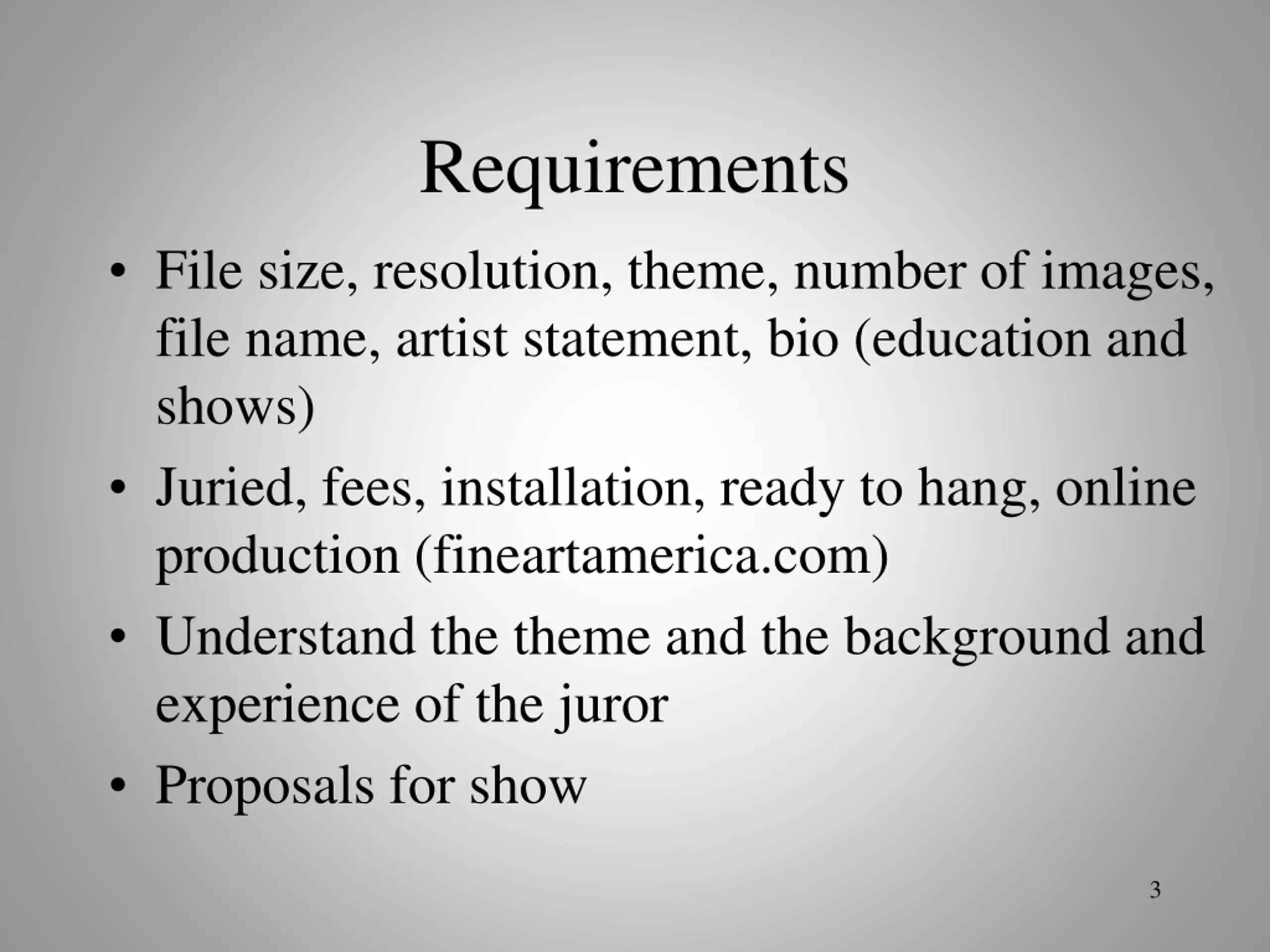 Requirements File size, resolution, theme, number of images, file name, artist statement, bio (education and shows) Juried, fees, installation, ready to hang, online production (fineartamerica.com) Understand the theme and the background and experience of the juror Proposals for show 3
