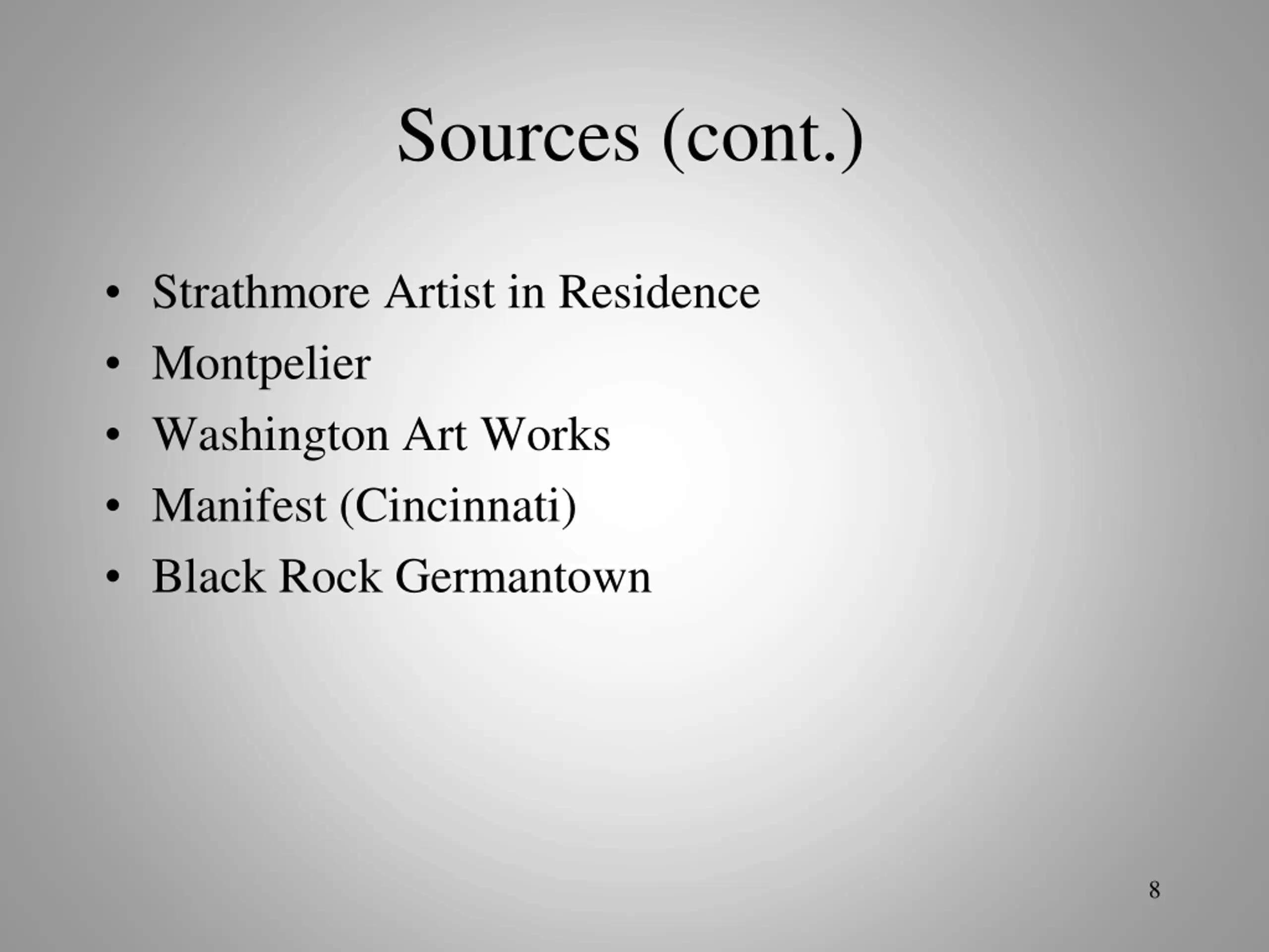 Sources (cont.) Strathmore Artist in Residence Montpelier Washington Art Works Manifest (Cincinnati) Black Rock Germantown 8