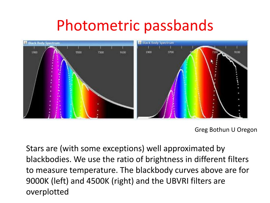 Photometric passbands Greg Bothun U Oregon Stars are (with some exceptions) well approximated by blackbodies. We use the ratio of brightness in different filters to measure temperature. The blackbody curves above are for 9000K (left) and 4500K (right) and the UBVRI filters are overplotted