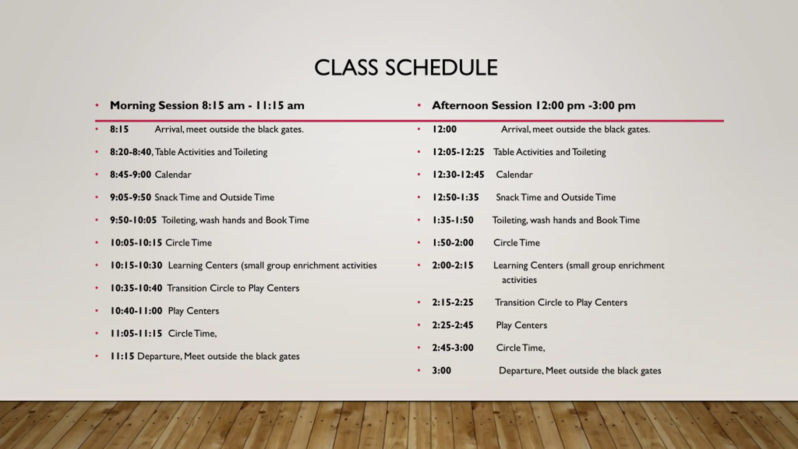 CLASS SCHEDULE Morning Session 8:15 am - 11:15 am Afternoon Session 12:00 pm -3:00 pm 8:15 Arrival, meet outside the black gates. 12:00 Arrival, meet outside the black gates. 8:20-8:40, Table Activities and Toileting 12:05-12:25 Table Activities and Toileting 8:45-9:00 Calendar 12:30-12:45 Calendar 9:05-9:50 Snack Time and Outside Time 12:50-1:35 Snack Time and Outside Time 9:50-10:05 Toileting, wash hands and Book Time 1:35-1:50 Toileting, wash hands and Book Time 10:05-10:15 Circle Time 1:50-2:00 Circle Time 10:15-10:30 Learning Centers (small group enrichment activities 2:00-2:15 Learning Centers (small group enrichment activities 10:35-10:40 Transition Circle to Play Centers 2:15-2:25 Transition Circle to Play Centers 10:40-11:00 Play Centers 2:25-2:45 Play Centers 11:05-11:15 Circle Time, 2:45-3:00 Circle Time, 11:15 Departure, Meet outside the black gates 3:00 Departure, Meet outside the black gates