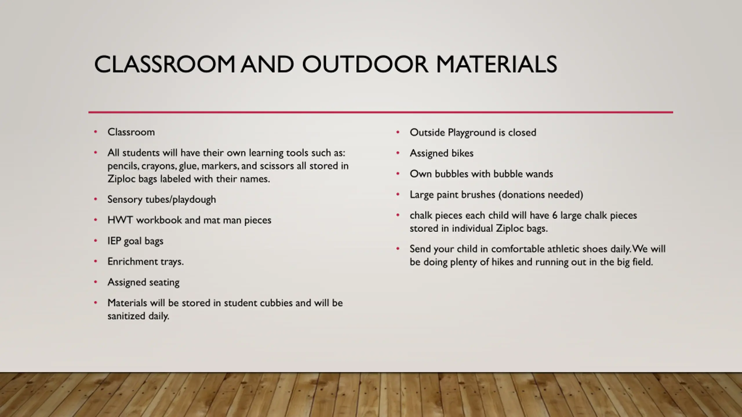CLASSROOM AND OUTDOOR MATERIALS Classroom Outside Playground is closed All students will have their own learning tools such as: pencils, crayons, glue,markers, and scissors all stored in Ziploc bags labeled with their names. Assigned bikes Own bubbles with bubble wands Large paint brushes (donations needed) Sensory tubes/playdough chalk pieces each child will have 6 large chalk pieces stored in individual Ziploc bags. HWT workbook and mat man pieces IEP goal bags Send your child in comfortable athletic shoes daily. We will be doing plenty of hikes and running out in the big field. Enrichment trays. Assigned seating Materials will be stored in student cubbies and will be sanitized daily.