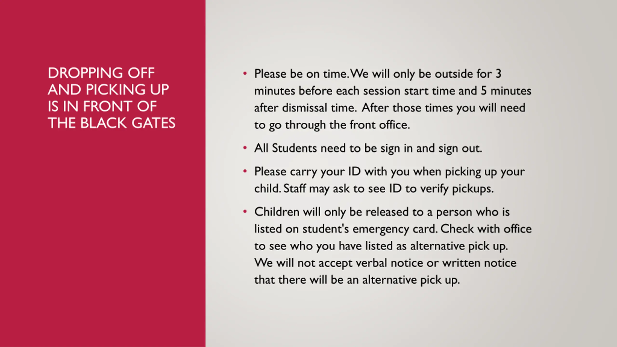 DROPPING OFF AND PICKING UP IS IN FRONT OF THE BLACK GATES Please be on time. We will only be outside for 3 minutes before each session start time and 5 minutes after dismissal time. After those times you will need to go through the front office. All Students need to be sign in and sign out. Please carry your ID with you when picking up your child. Staff may ask to see ID to verify pickups. Children will only be released to a person who is listed on student's emergency card. Check with office to see who you have listed as alternative pick up. We will not accept verbal notice or written notice that there will be an alternative pick up.