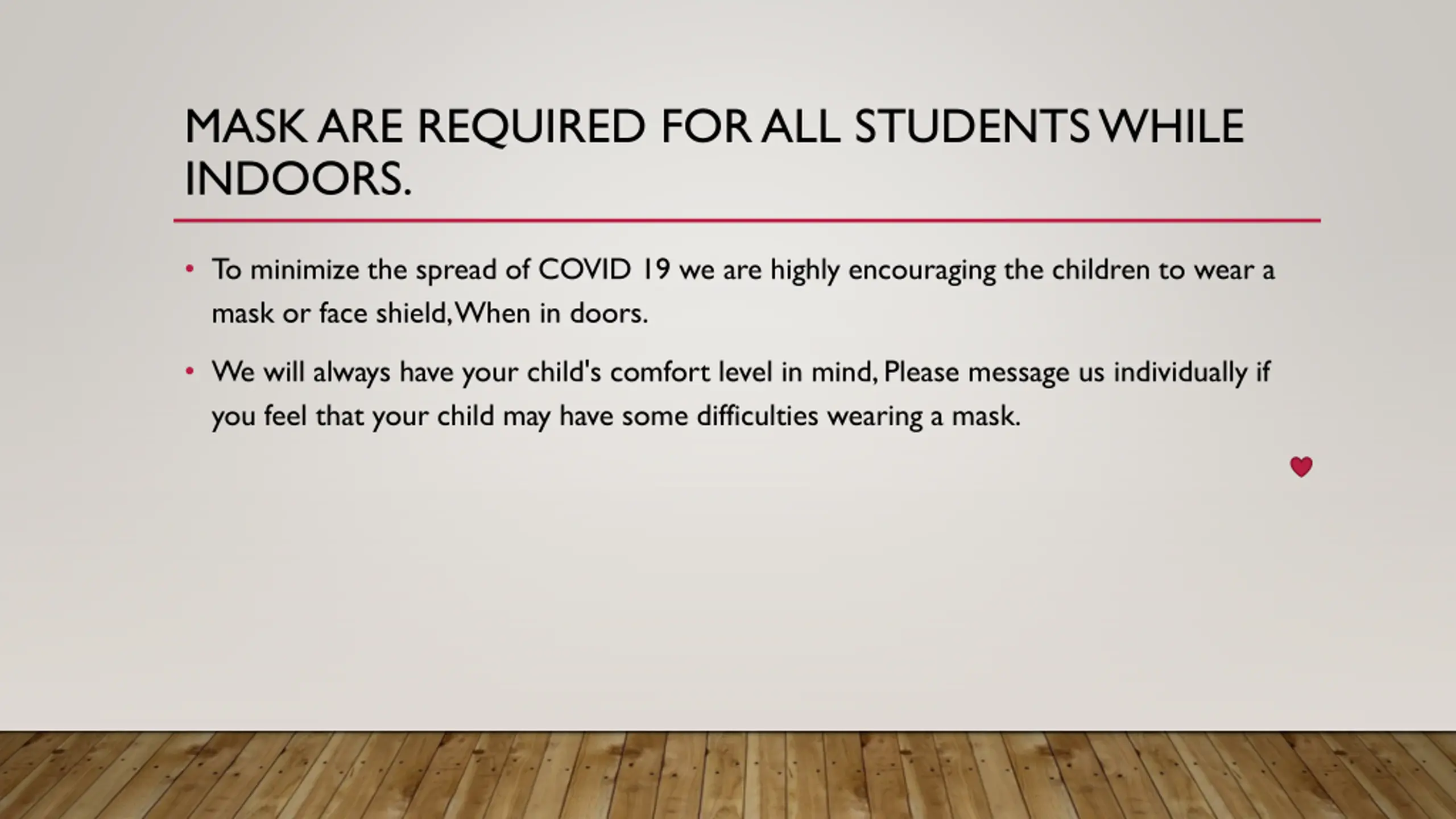 MASK ARE REQUIRED FOR ALL STUDENTS WHILE INDOORS. To minimize the spread of COVID 19 we are highly encouraging the children to wear a mask or face shield, When in doors. We will always have your child's comfort level in mind, Please message us individually if you feel that your child may have some difficulties wearing a mask.