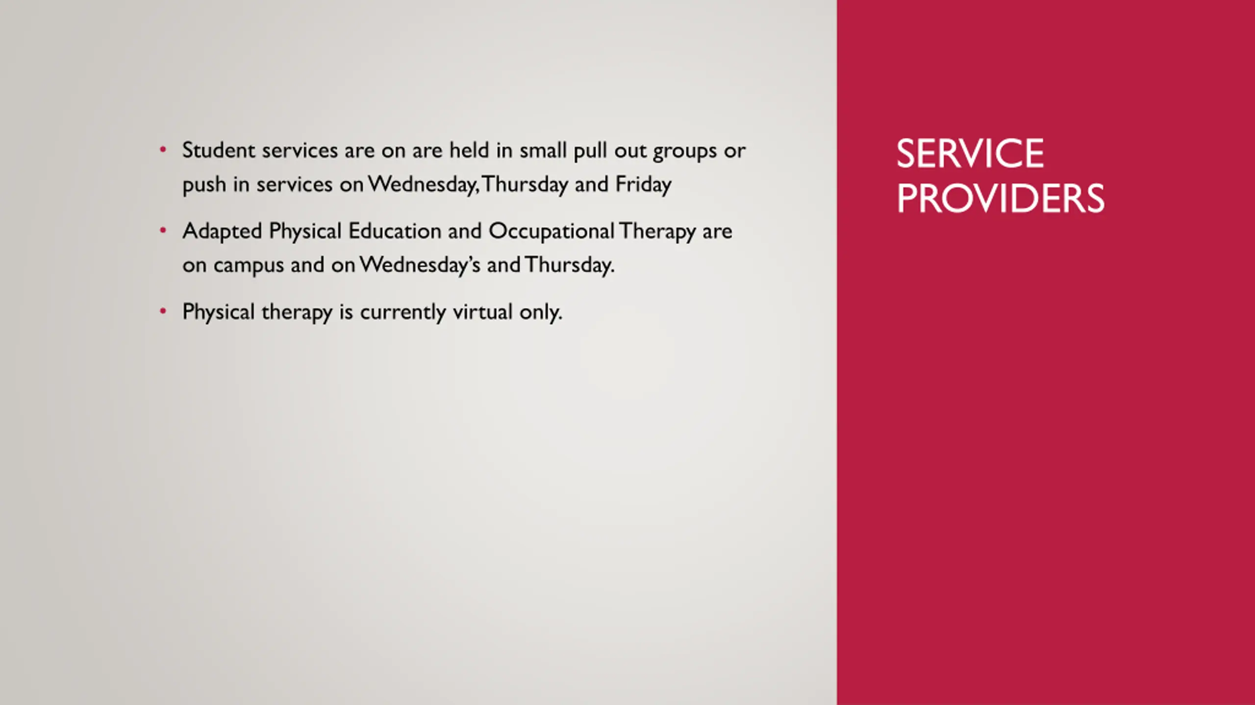 SERVICE PROVIDERS Student services are on are held in small pull out groups or push in services on Wednesday, Thursday and Friday Adapted Physical Education and Occupational Therapy are on campus and on Wednesday s and Thursday. Physical therapy is currently virtual only.