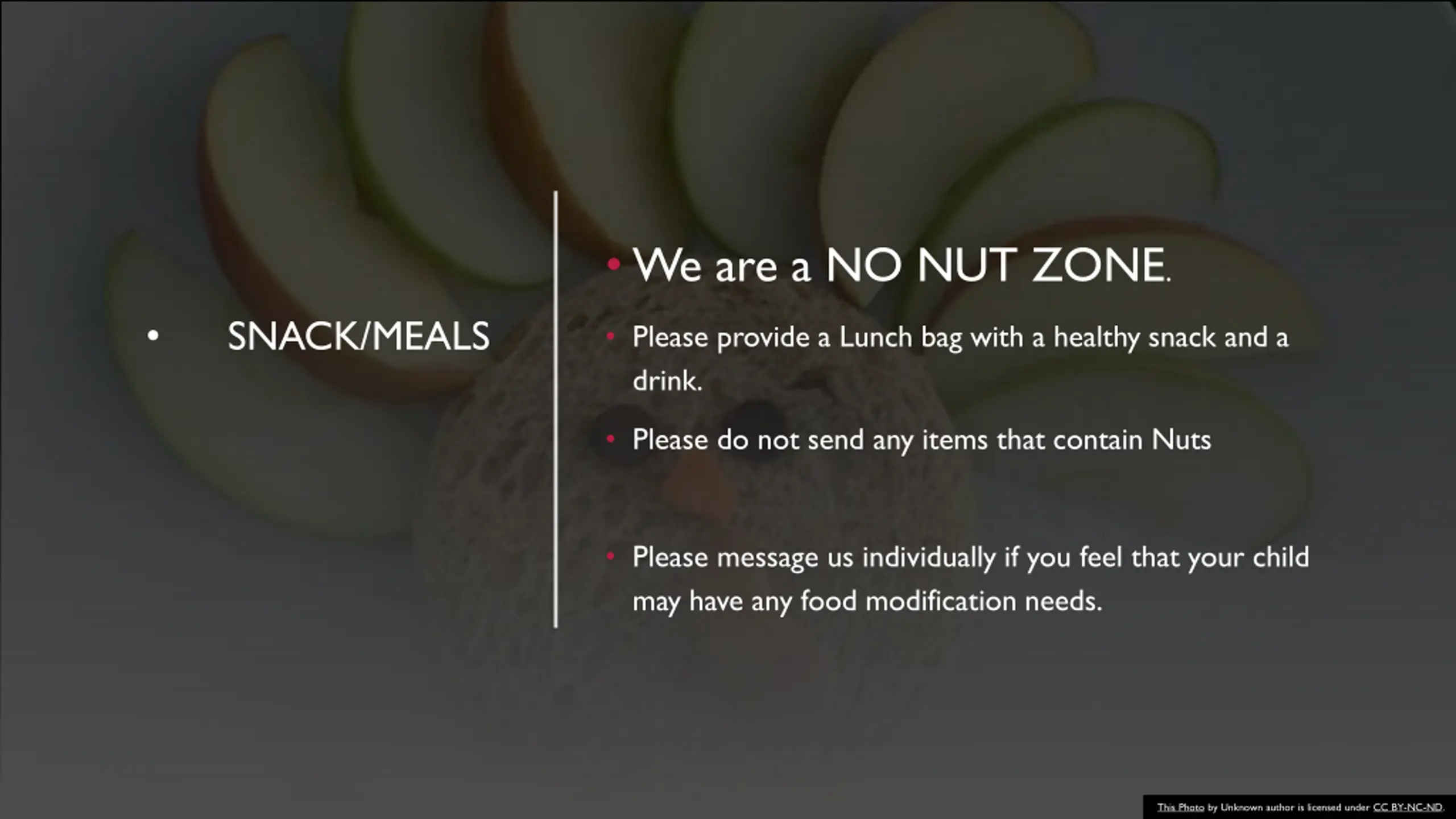 We are a NO NUT ZONE. SNACK/MEALS Please provide a Lunch bag with a healthy snack and a drink. Please do not send any items that contain Nuts Please message us individually if you feel that your child may have any food modification needs. This Photo by Unknown author is licensed under CC BY-NC-ND.