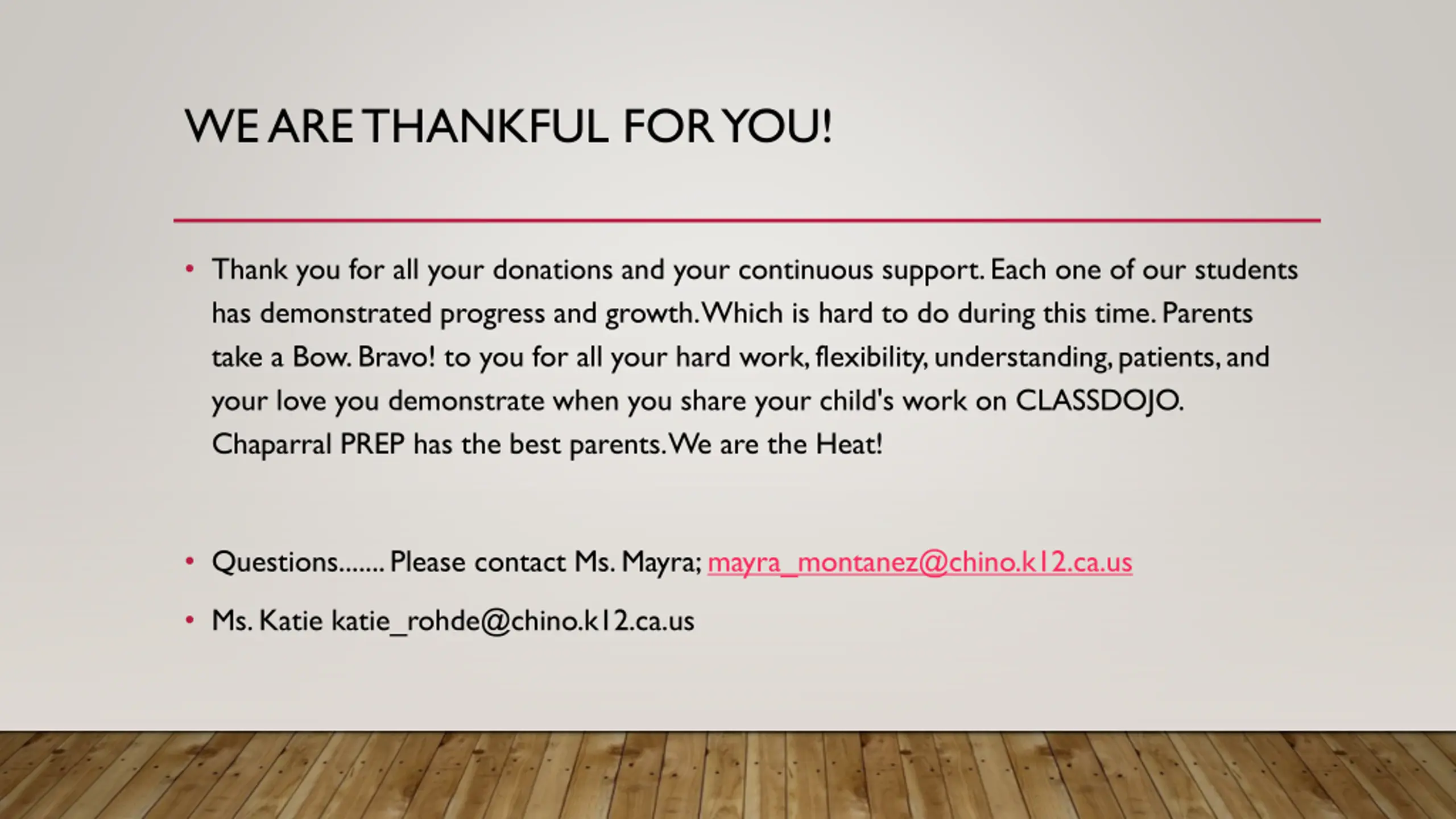 WE ARE THANKFUL FOR YOU! Thank you for all your donations and your continuous support. Each one of our students has demonstrated progress and growth. Which is hard to do during this time. Parents take a Bow. Bravo! to you for all your hard work, flexibility, understanding, patients, and your love you demonstrate when you share your child's work on CLASSDOJO. Chaparral PREP has the best parents. We are the Heat! Questions....... Please contact Ms. Mayra; mayra_montanez@chino.k12.ca.us Ms. Katie katie_rohde@chino.k12.ca.us