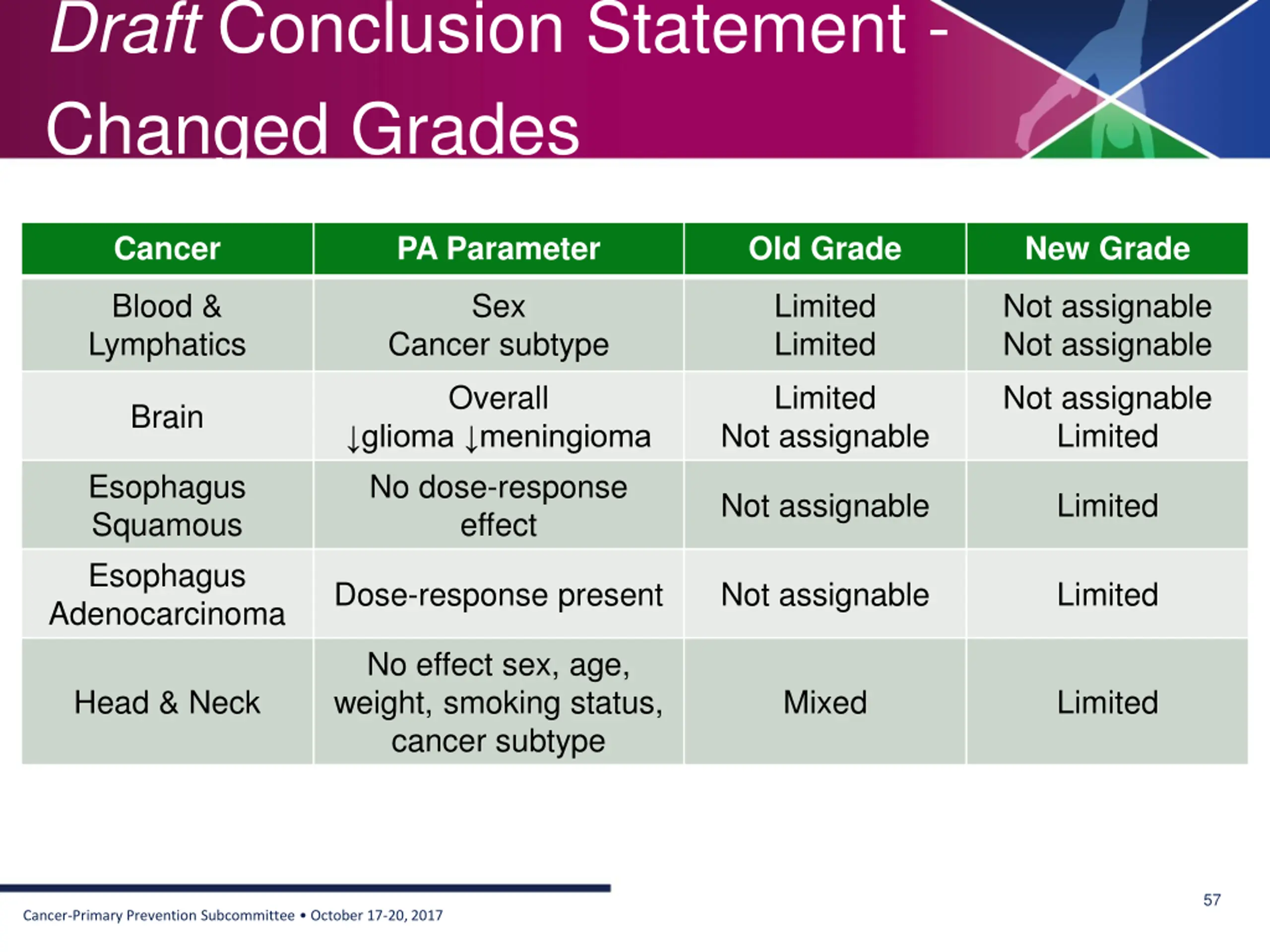 Draft Conclusion Statement - Changed Grades Cancer PA Parameter Old Grade New Grade Blood & Lymphatics Sex Limited Limited Not assignable Not assignable Cancer subtype Overall Limited Not assignable Limited Brain Not assignable glioma meningioma No dose-response effect Esophagus Squamous Esophagus Adenocarcinoma Not assignable Limited Dose-response present Not assignable Limited No effect sex, age, weight, smoking status, cancer subtype Head & Neck Mixed Limited 57 Cancer-Primary Prevention Subcommittee October 17-20, 2017