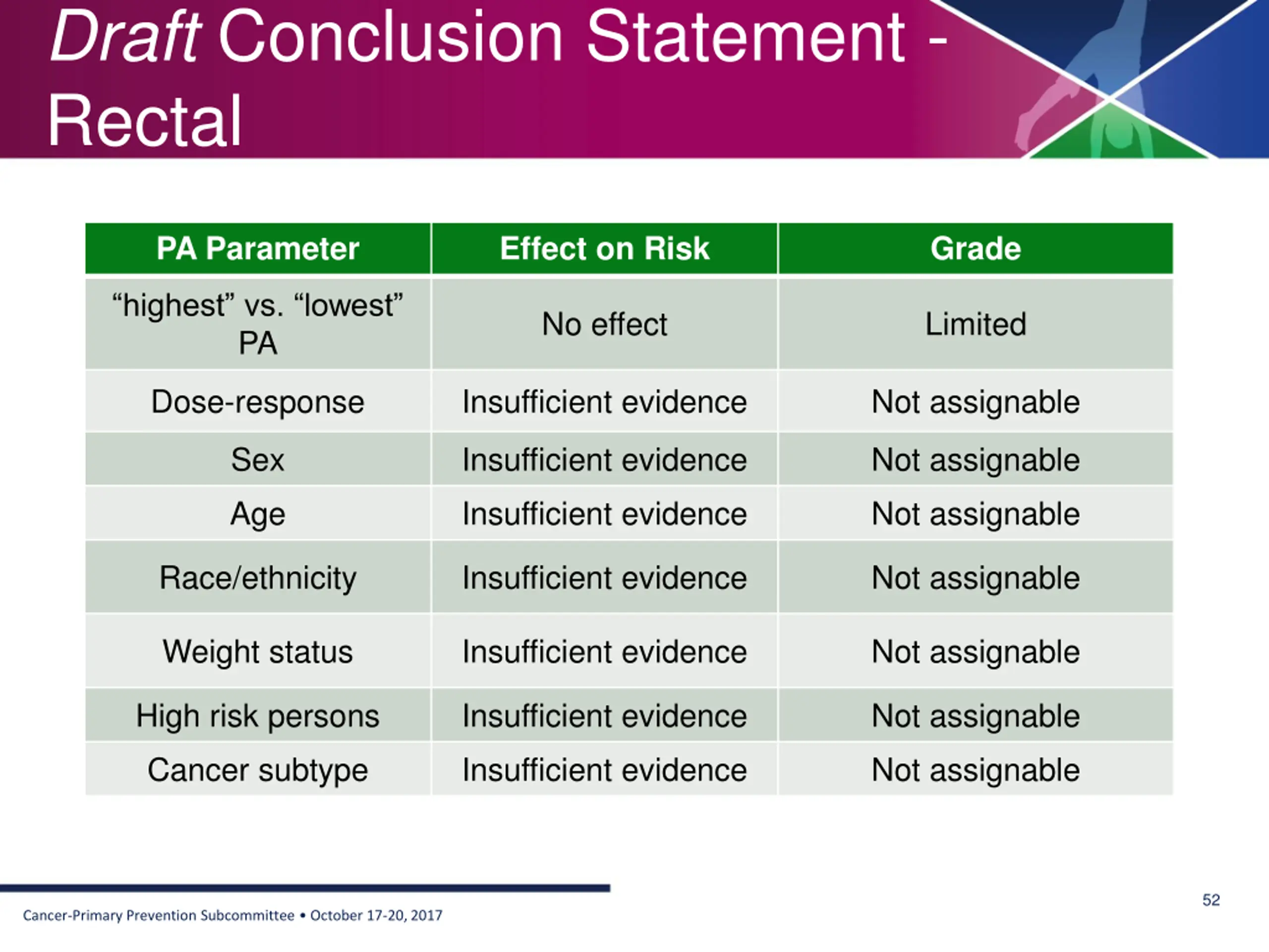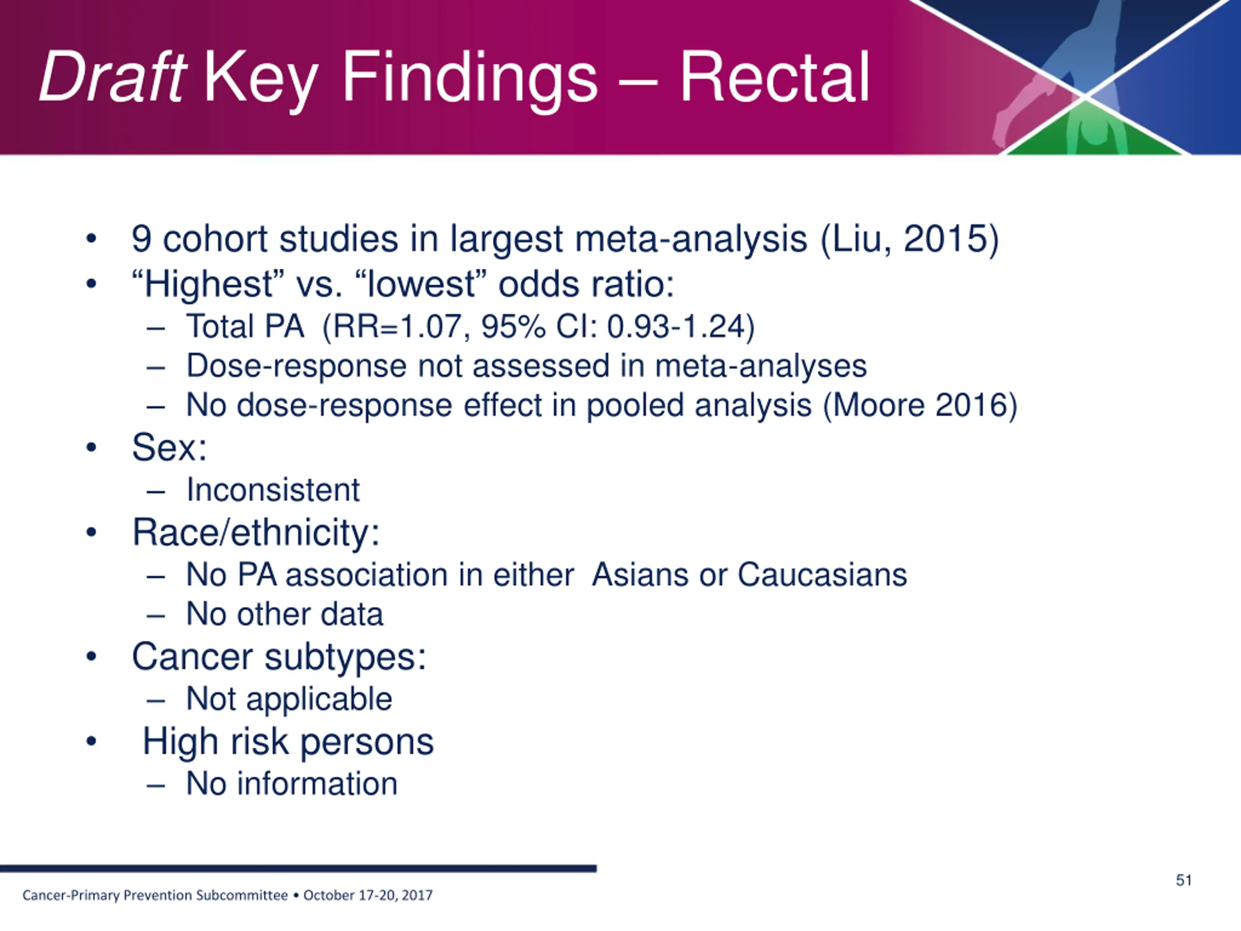 Draft Key Findings Rectal 9 cohort studies in largest meta-analysis (Liu, 2015) Highest vs. lowest odds ratio: Total PA (RR=1.07, 95% CI: 0.93-1.24) Dose-response not assessed in meta-analyses No dose-response effect in pooled analysis (Moore 2016) Sex: Inconsistent Race/ethnicity: No PA association in either Asians or Caucasians No other data Cancer subtypes: Not applicable High risk persons No information 51 Cancer-Primary Prevention Subcommittee October 17-20, 2017
