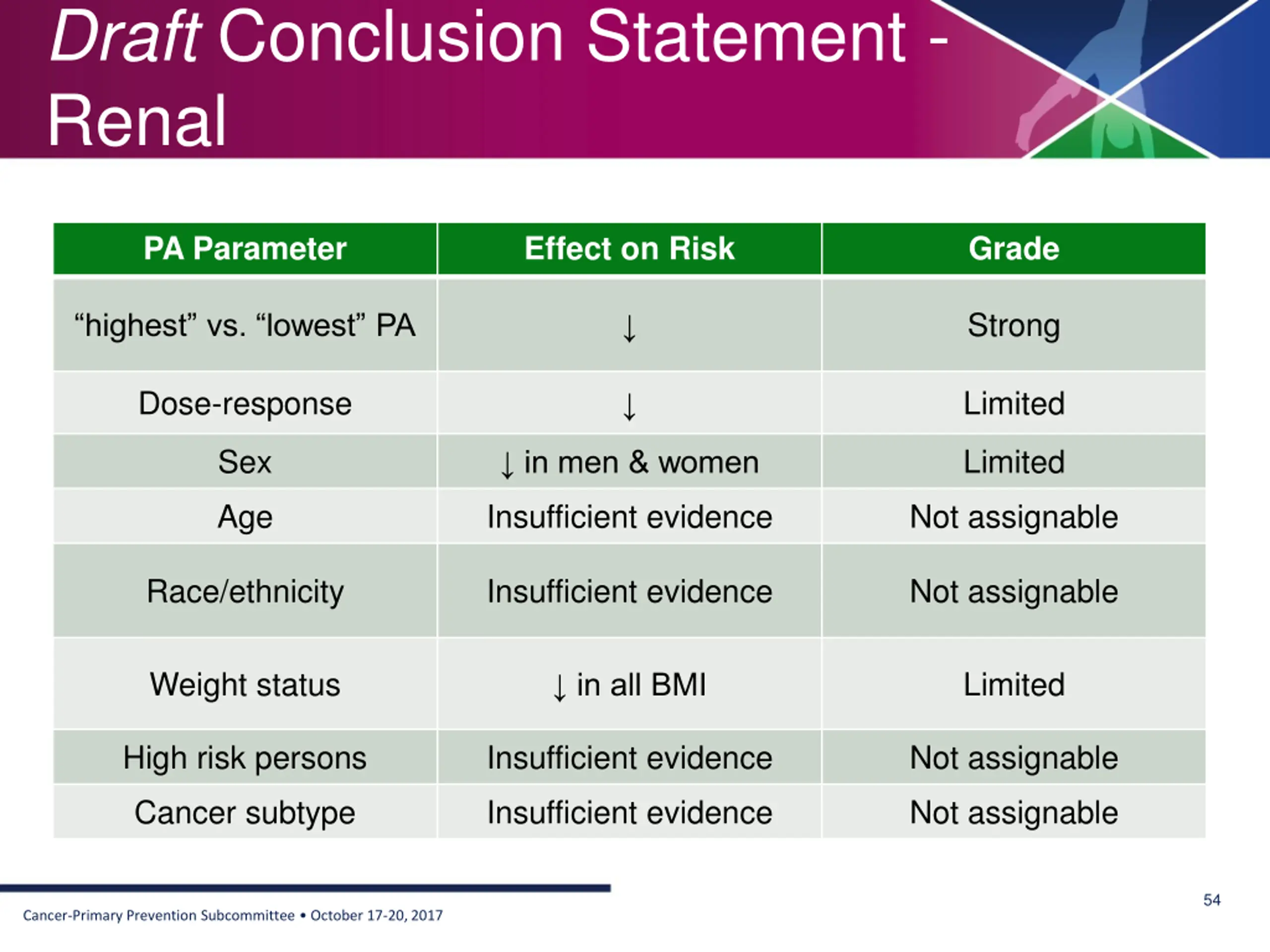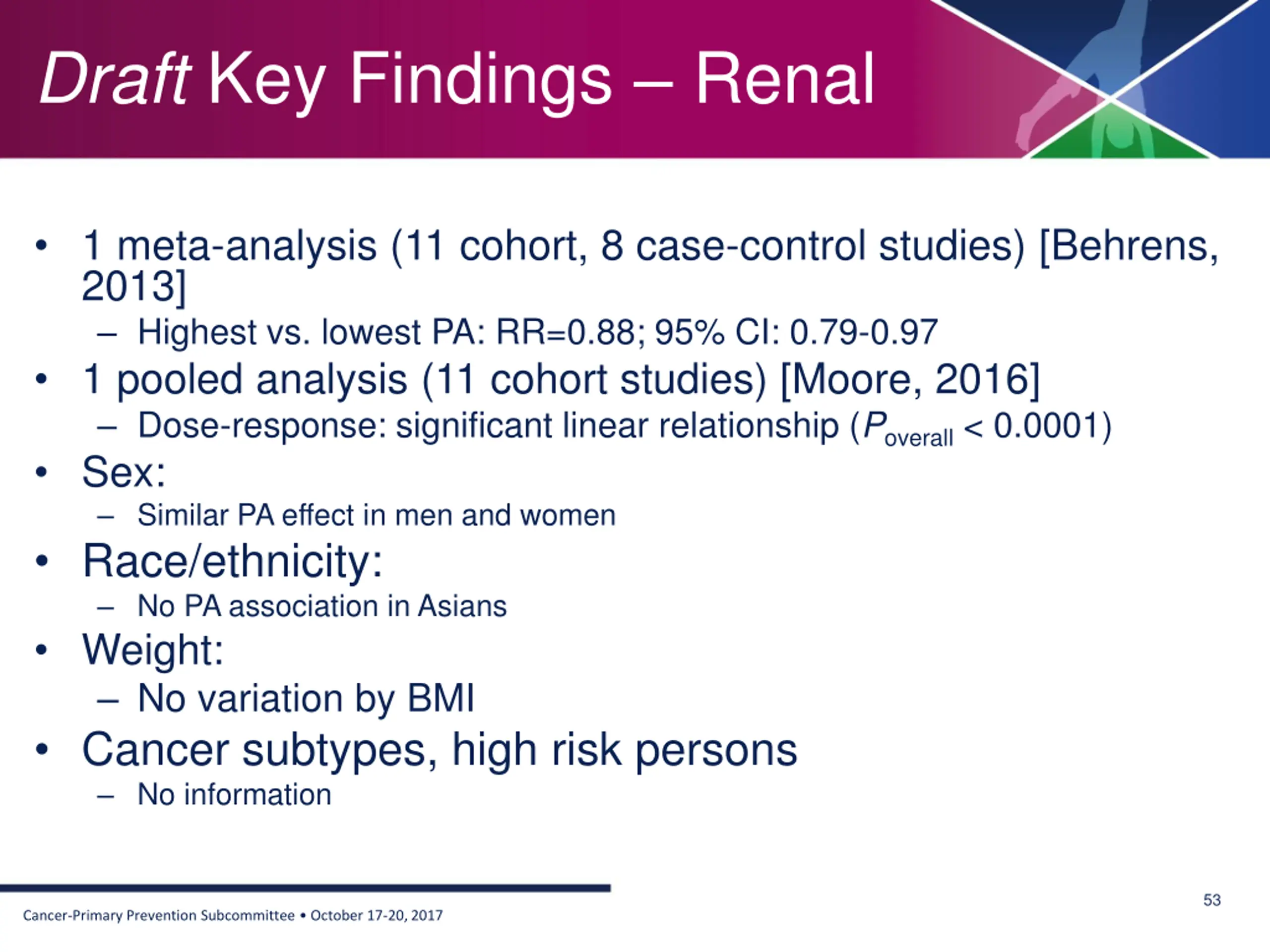 Draft Key Findings Renal 1 meta-analysis (11 cohort, 8 case-control studies) [Behrens, 2013] Highest vs. lowest PA: RR=0.88; 95% CI: 0.79-0.97 1 pooled analysis (11 cohort studies) [Moore, 2016] Dose-response: significant linear relationship (Poverall < 0.0001) Sex: Similar PA effect in men and women Race/ethnicity: No PA association in Asians Weight: No variation by BMI Cancer subtypes, high risk persons No information 53 Cancer-Primary Prevention Subcommittee October 17-20, 2017