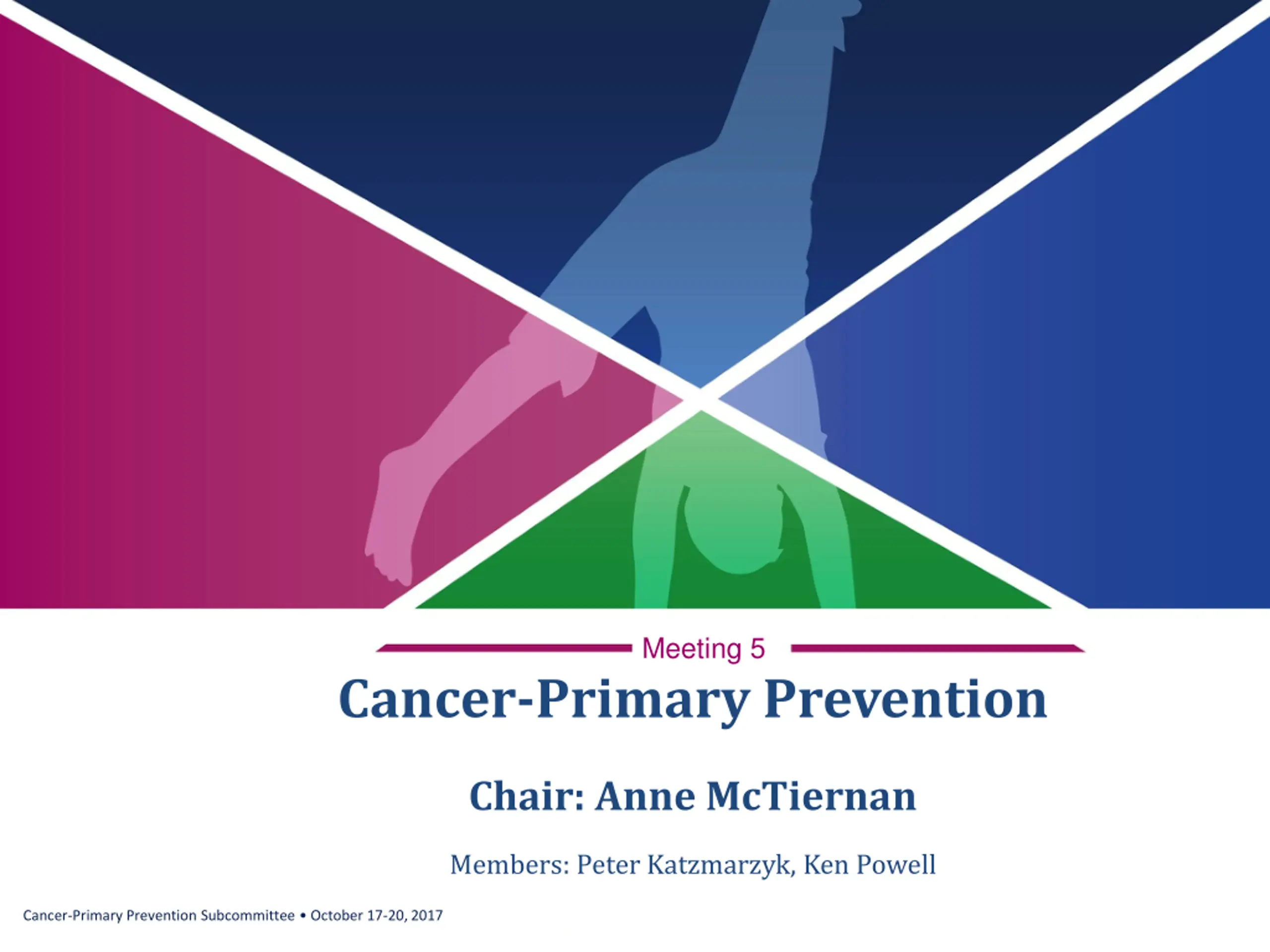 Meeting 5 Cancer-Primary Prevention Chair: Anne McTiernan Members: Peter Katzmarzyk, Ken Powell Cancer-Primary Prevention Subcommittee October 17-20, 2017