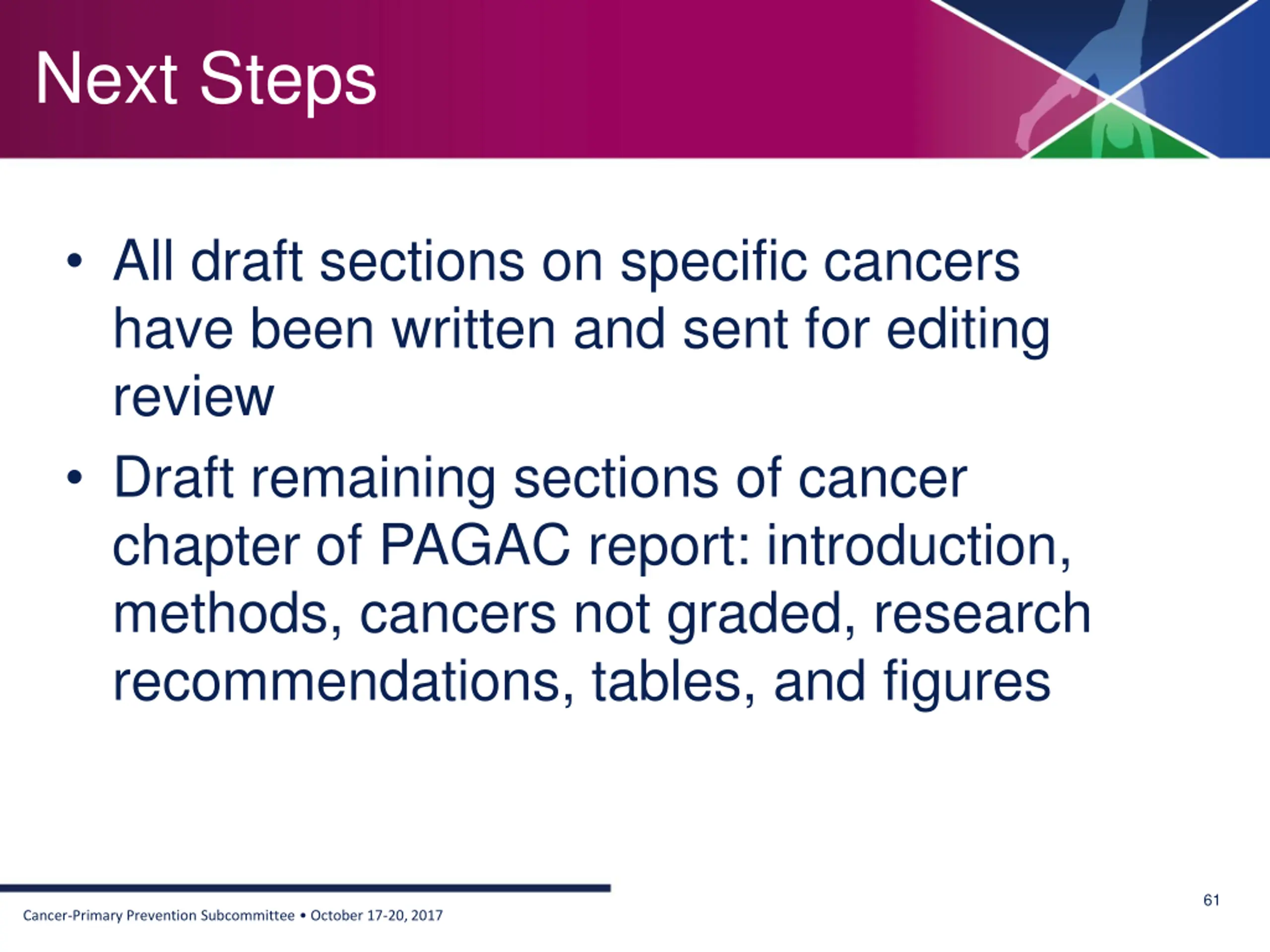 Next Steps All draft sections on specific cancers have been written and sent for editing review Draft remaining sections of cancer chapter of PAGAC report: introduction, methods, cancers not graded, research recommendations, tables, and figures 61 Cancer-Primary Prevention Subcommittee October 17-20, 2017