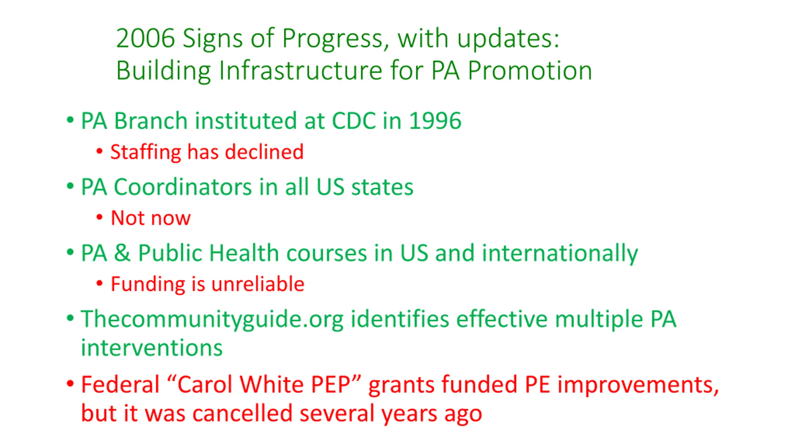 2006 Signs of Progress, with updates: Building Infrastructure for PA Promotion PA Branch instituted at CDC in 1996 Staffing has declined PA Coordinators in all US states Not now PA & Public Health courses in US and internationally Funding is unreliable Thecommunityguide.org identifies effective multiple PA interventions Federal Carol White PEP grants funded PE improvements, but it was cancelled several years ago