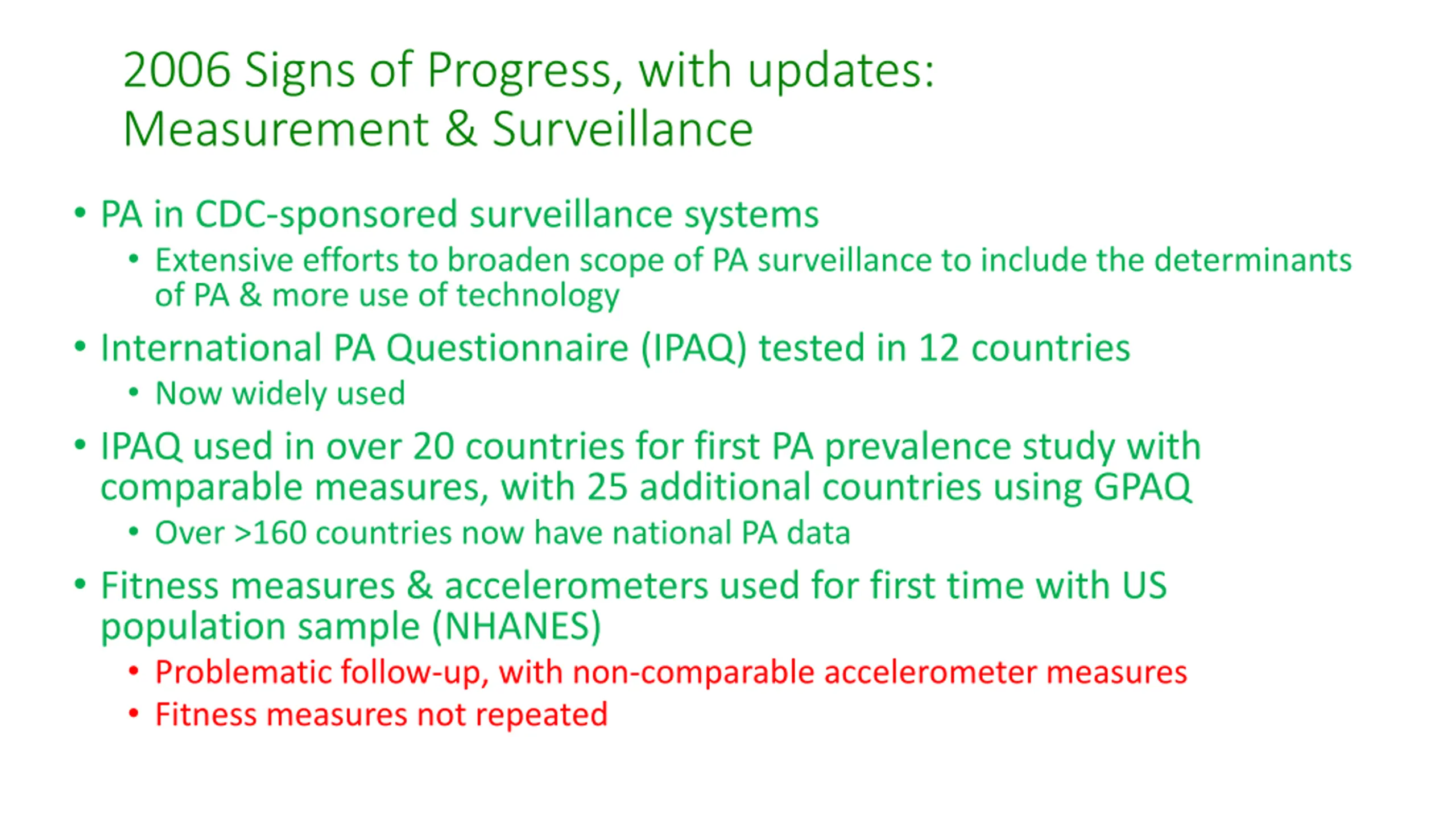 2006 Signs of Progress, with updates: Measurement & Surveillance PA in CDC-sponsored surveillance systems Extensive efforts to broaden scope of PA surveillance to include the determinants of PA & more use of technology International PA Questionnaire (IPAQ) tested in 12 countries Now widely used IPAQ used in over 20 countries for first PA prevalence study with comparable measures, with 25 additional countries using GPAQ Over >160 countries now have national PA data Fitness measures & accelerometers used for first time with US population sample (NHANES) Problematic follow-up, with non-comparable accelerometer measures Fitness measures not repeated