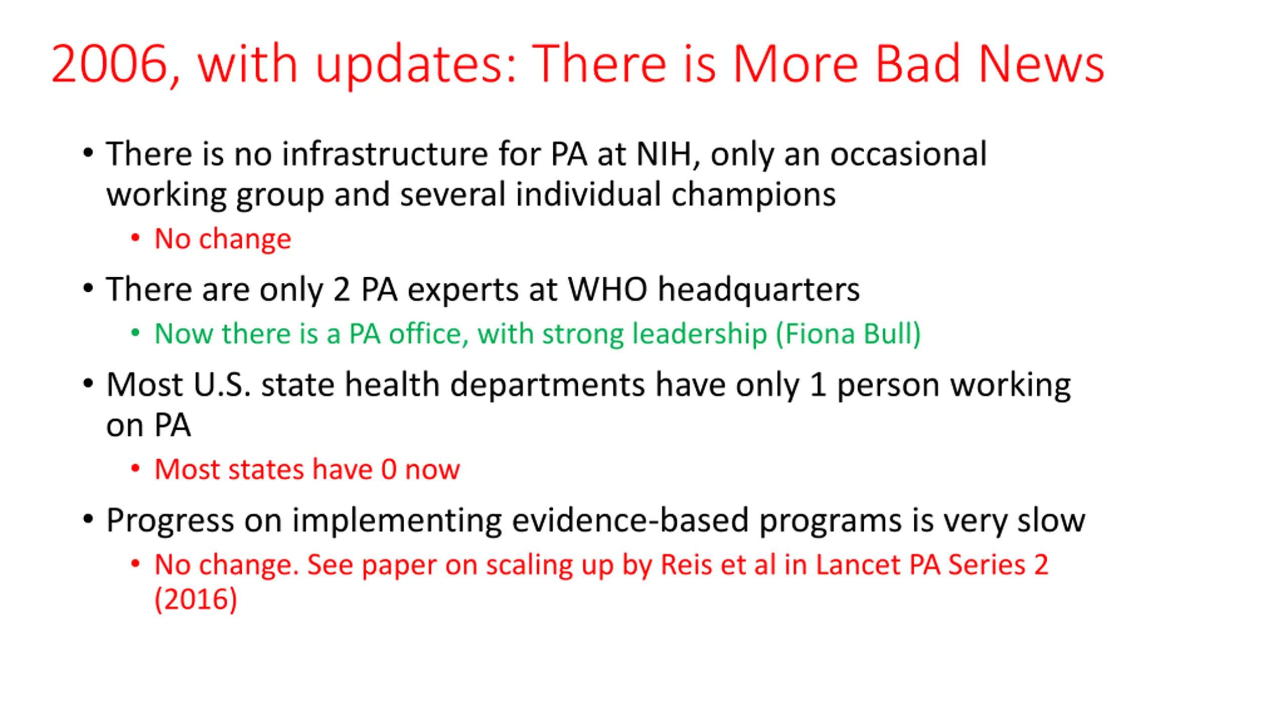 2006, with updates: There is More Bad News There is no infrastructure for PA at NIH, only an occasional working group and several individual champions No change There are only 2 PA experts at WHO headquarters Now there is a PA office, with strong leadership (Fiona Bull) Most U.S. state health departments have only 1 person working on PA Most states have 0 now Progress on implementing evidence-based programs is very slow No change. See paper on scaling up by Reis et al in Lancet PA Series 2 (2016)