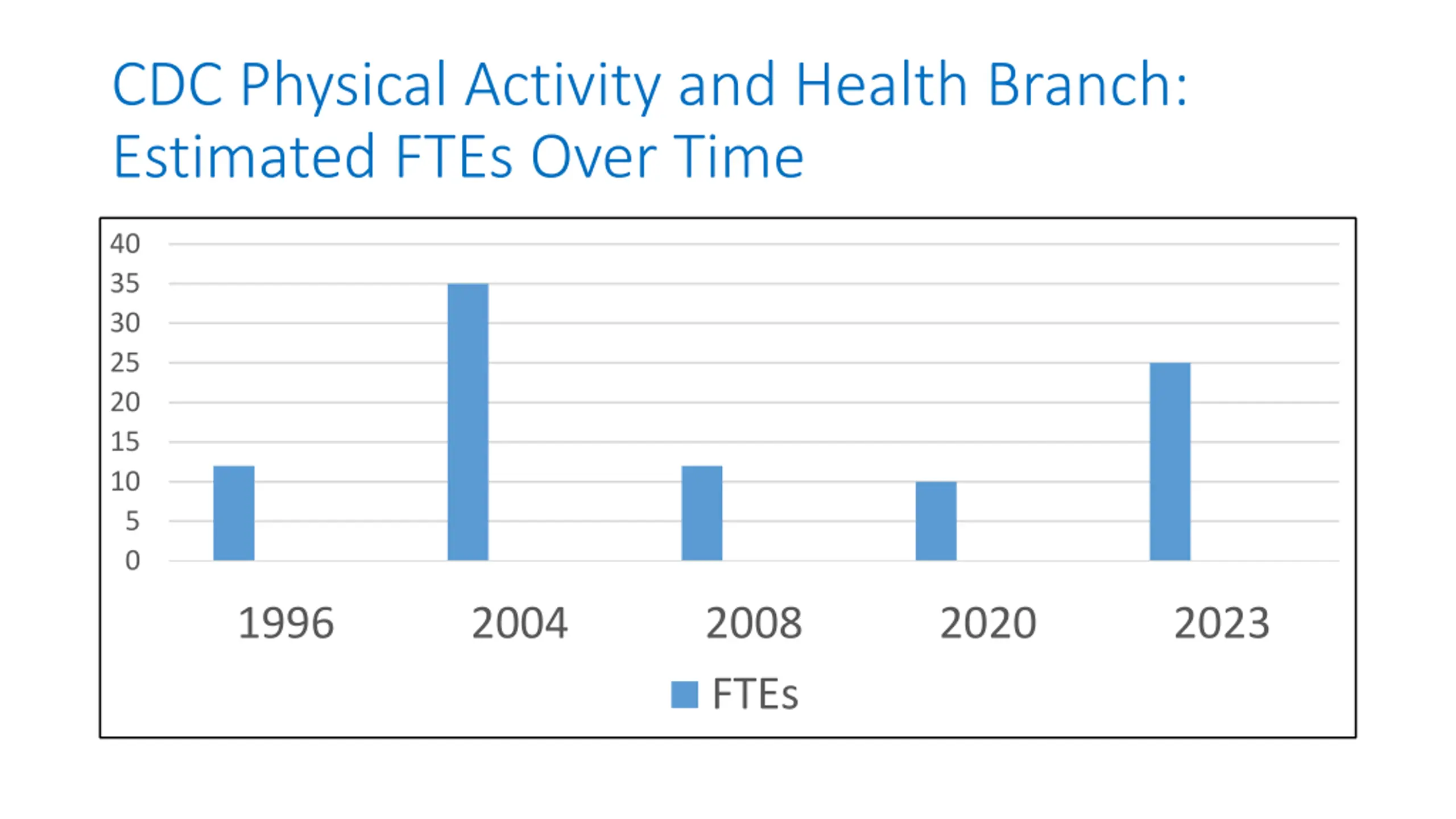 CDC Physical Activity and Health Branch: Estimated FTEs Over Time 40 35 30 25 20 15 10 5 0 1996 2004 2008 FTEs 2020 2023