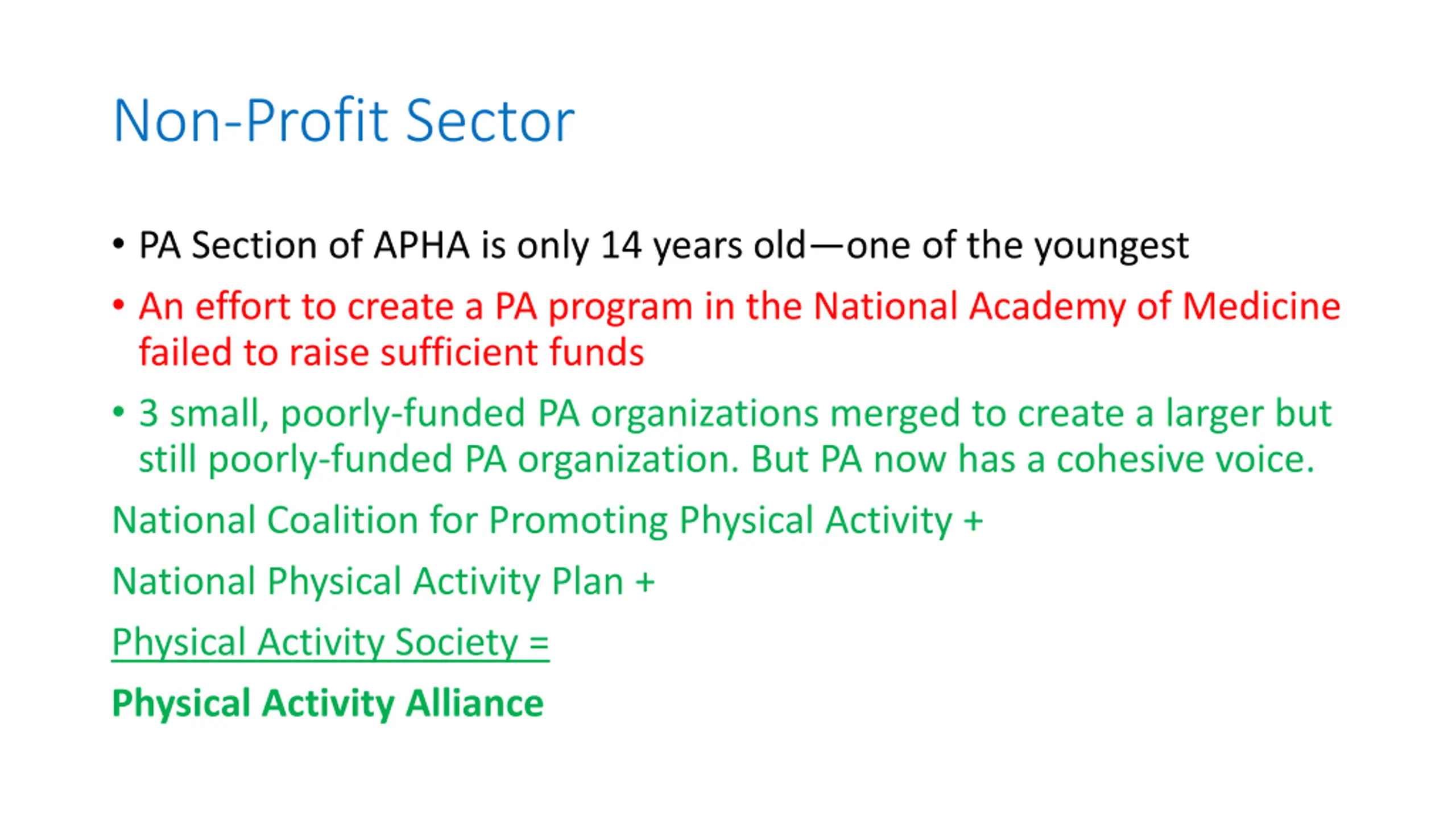 Non-Profit Sector PA Section of APHA is only 14 years old one of the youngest An effort to create a PA program in the National Academy of Medicine failed to raise sufficient funds 3 small, poorly-funded PA organizations merged to create a larger but still poorly-funded PA organization. But PA now has a cohesive voice. National Coalition for Promoting Physical Activity + National Physical Activity Plan + Physical Activity Society = Physical Activity Alliance
