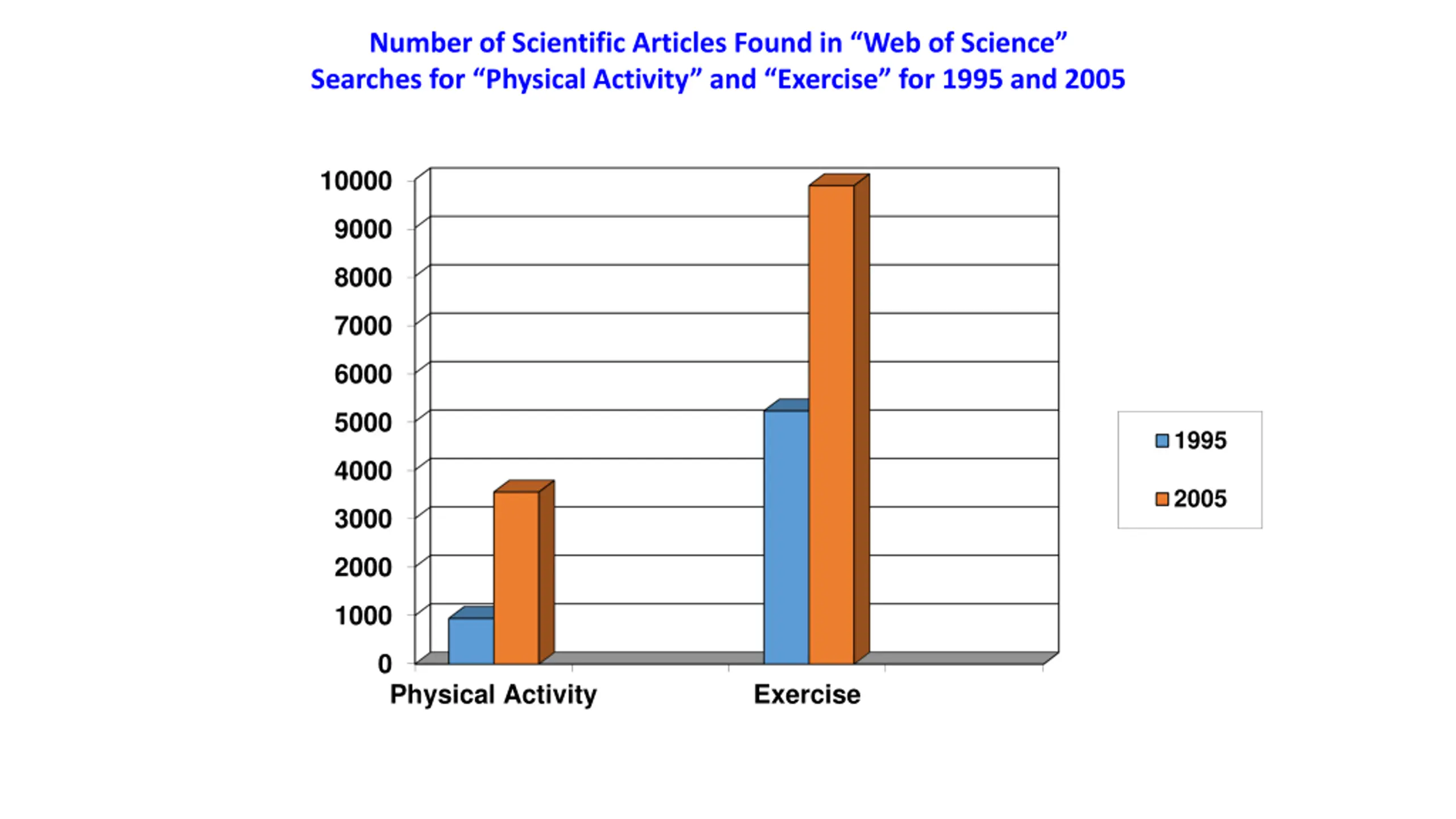 Number of Scientific Articles Found in Web of Science Searches for Physical Activity and Exercise for 1995 and 2005 10000 9000 8000 7000 6000 5000 1995 4000 2005 3000 2000 1000 0 Physical Activity Exercise